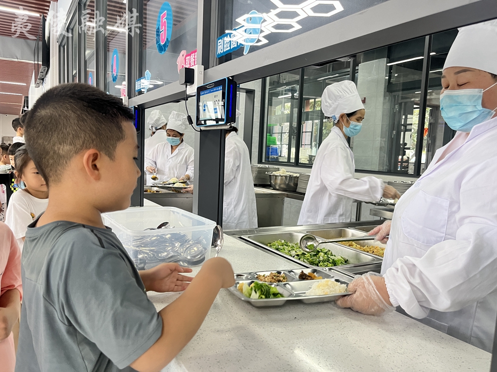 “以前吃饭是配餐,现在改成在食堂打饭就餐,菜品新鲜又好吃。”六年级学生张嘉诚开心地告诉记者,食堂还能免费加饭菜,满足不同食量的同学。为了保证学生饮食营养健康,学校食堂遵循每天不少于12种食材,每周不少于25种食材的原则,每餐10元就能吃上两荤两素一汤。