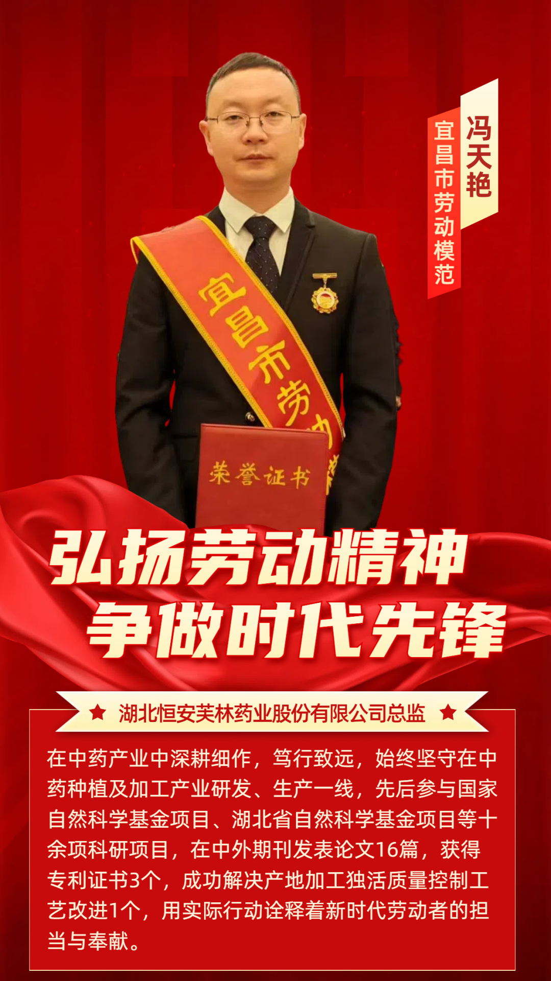 冯天艳不仅在工作中取得了卓越成就,还始终践行着劳模精神,发挥着模范带头作用。他现任湖北恒安芙林药业股份有限公司总监,高级农艺师、医药工程工程师,2020年被评为夷陵区劳动模范。多年来,他完成了公司中药配方颗粒500多个品种的工艺转化投产,建立了完整的技术体系;转入中药供应链建设后,成功推动中药材种植、产地加工项目的发展,为当地带来了大量的就业岗位,促进了地方经济的发展。