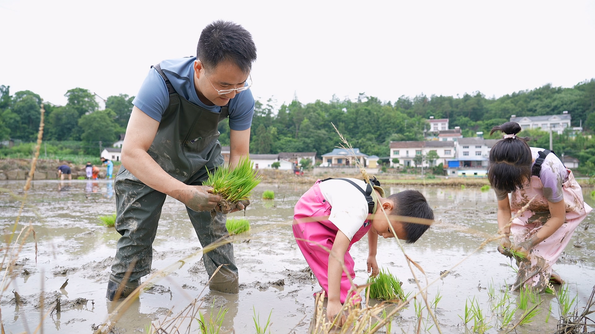 抓完泥鳅,孩子们顾不上清洗身上和脸上的泥巴,立马投入到插秧的“工作中”。他们小心翼翼踏入清凉的水田,学习插秧的基本手势时,泥土瞬间裹住了雨靴。弯腰、分苗、插入、扶正……看似简单的动作,让孩子们第一次体会到“手把青秧插满田”的不易与踏实。爸爸妈妈们在一旁也没闲着,妈妈扶着儿子的手,一起将嫩绿的秧苗稳稳插入泥土中。有的爸爸索性自己动手插秧。