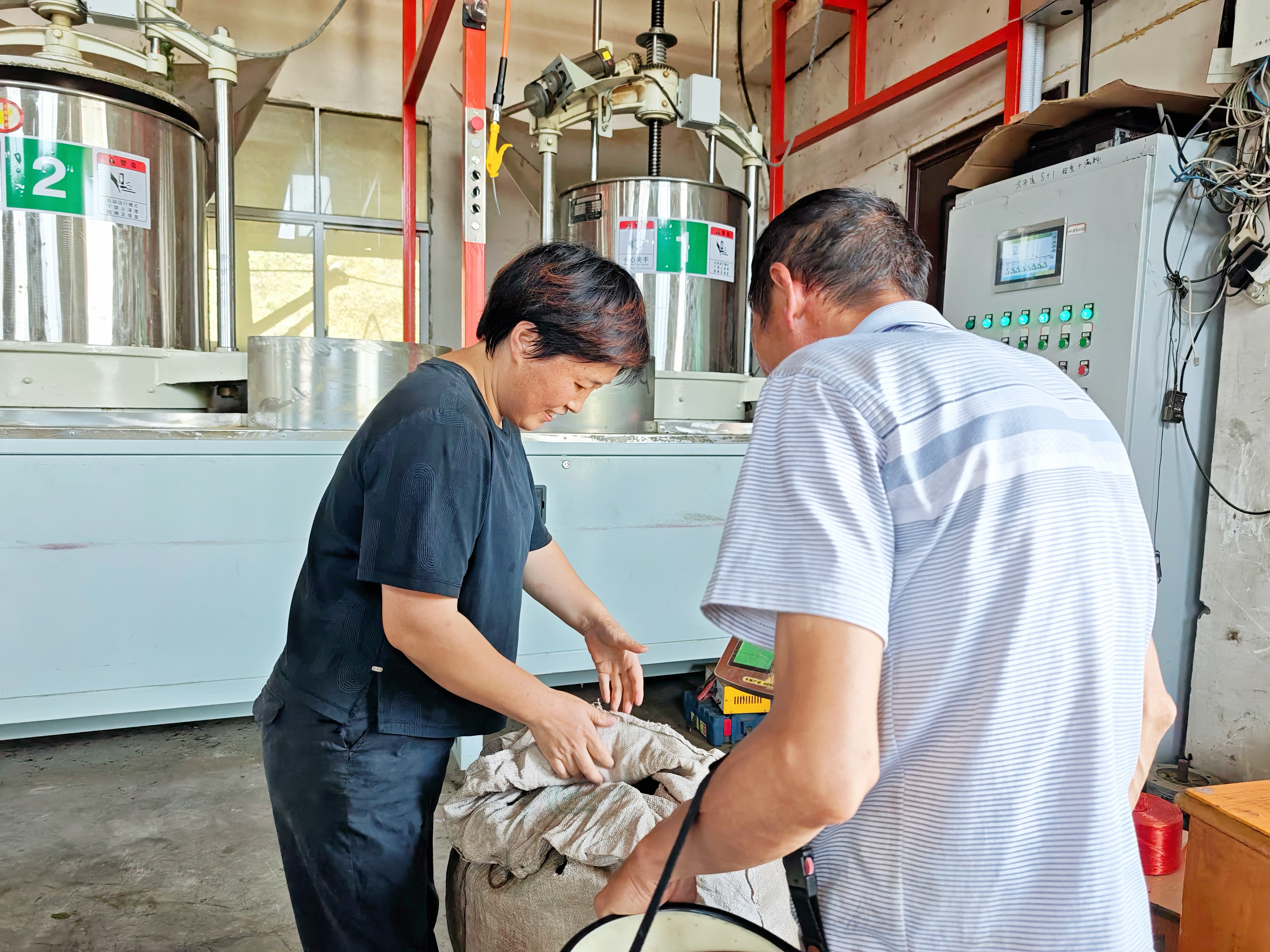 清晨,宜昌碧水云尖茶叶专业合作社厂房内机器轰鸣声不断,今年新添置的全自动揉捻设备将一筐筐茶叶送进机器揉捻,负责人周燕正在门口收购茶叶。