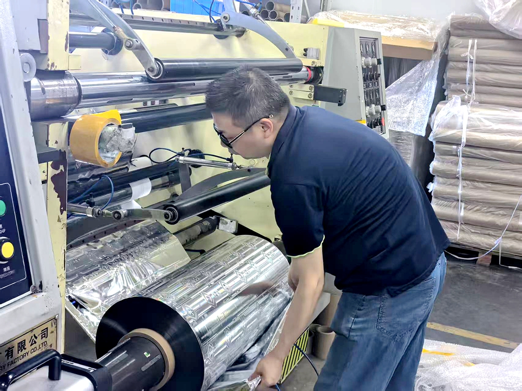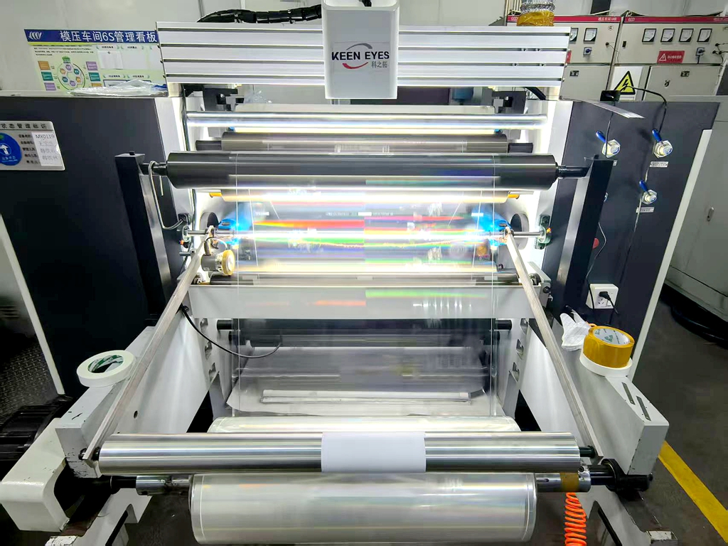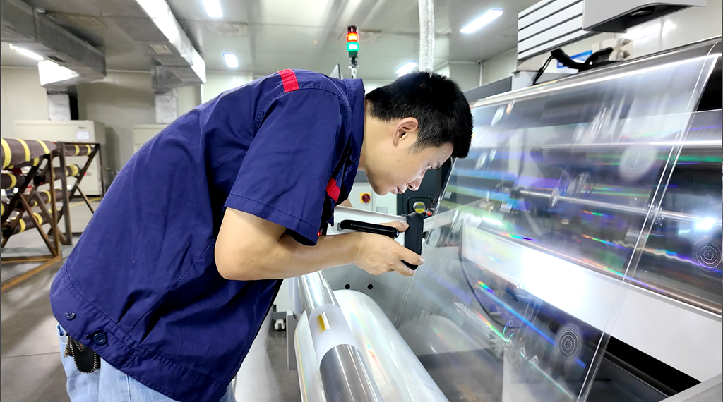 加工车间内,一卷卷透明且映射着七彩光芒的薄膜正在涂布机中进行图案印刻,花样绚丽,看似立体感十足的薄膜拿到手中却无半分凹凸感。正是这款激光全息光刻微纳防伪转移功能膜,让宜美特在细分领域脱颖而出。这一技术突破了传统防伪局限,在包装领域表现亮眼。