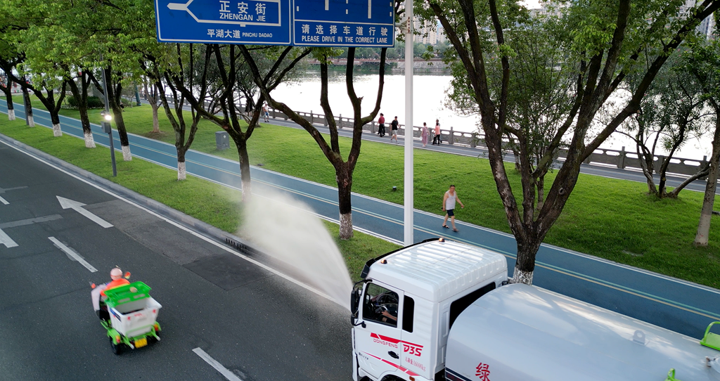 人工牵管浇灌、洒水车喷灌、自动喷淋系统喷洒、抗旱水袋注水、滴水软管滴灌……城区主次干道上,平均每天20台大型洒水车分时段循环喷洒,既浇灌绿地,也为城市降温。