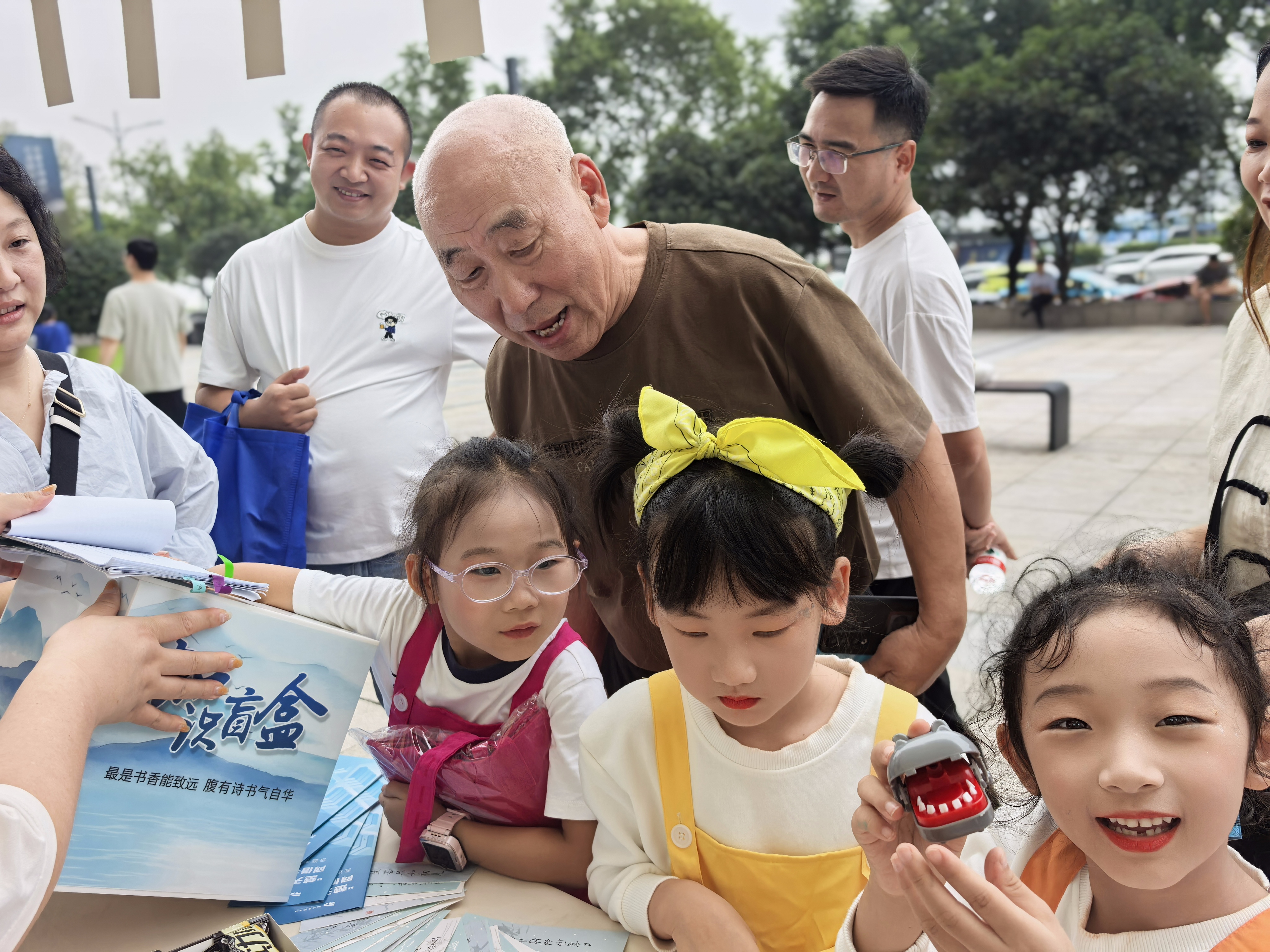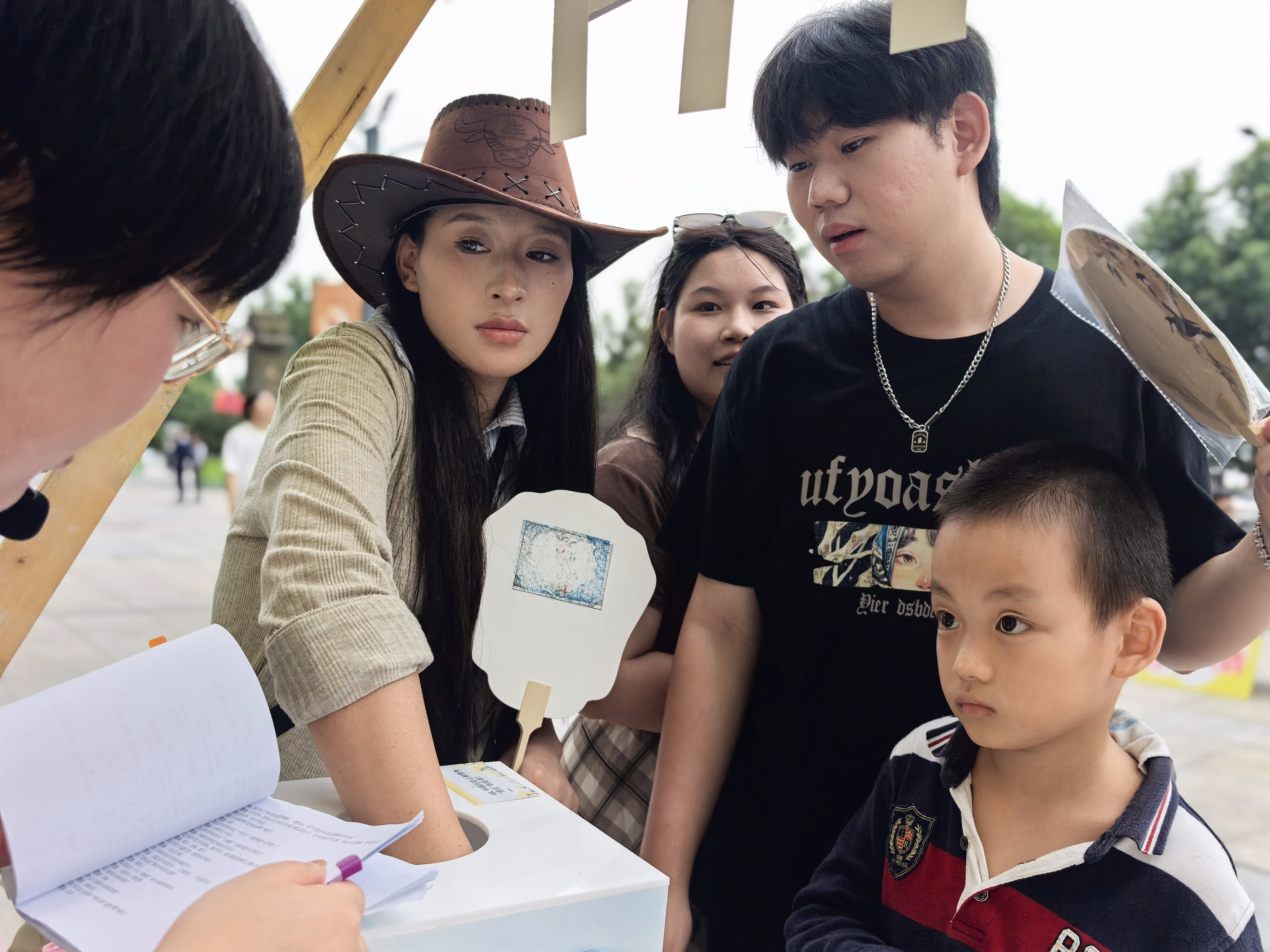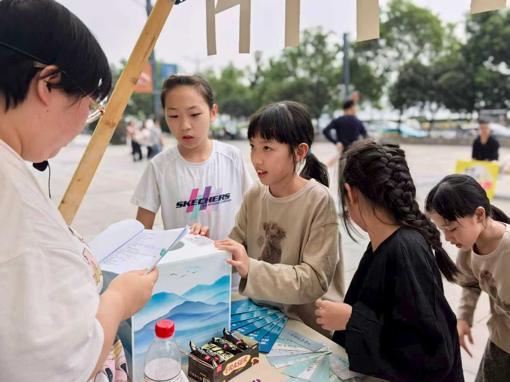 与舞台表演相呼应的互动体验市集区同样人气十足。夷陵区图书馆带来的“知识盲盒”展示区尤为引人注目。这些设计精美的盲盒内装有涵盖地方风采、历史文化、百科知识和文学诗词的趣味题目,参与者通过答题可获得特色文创产品。