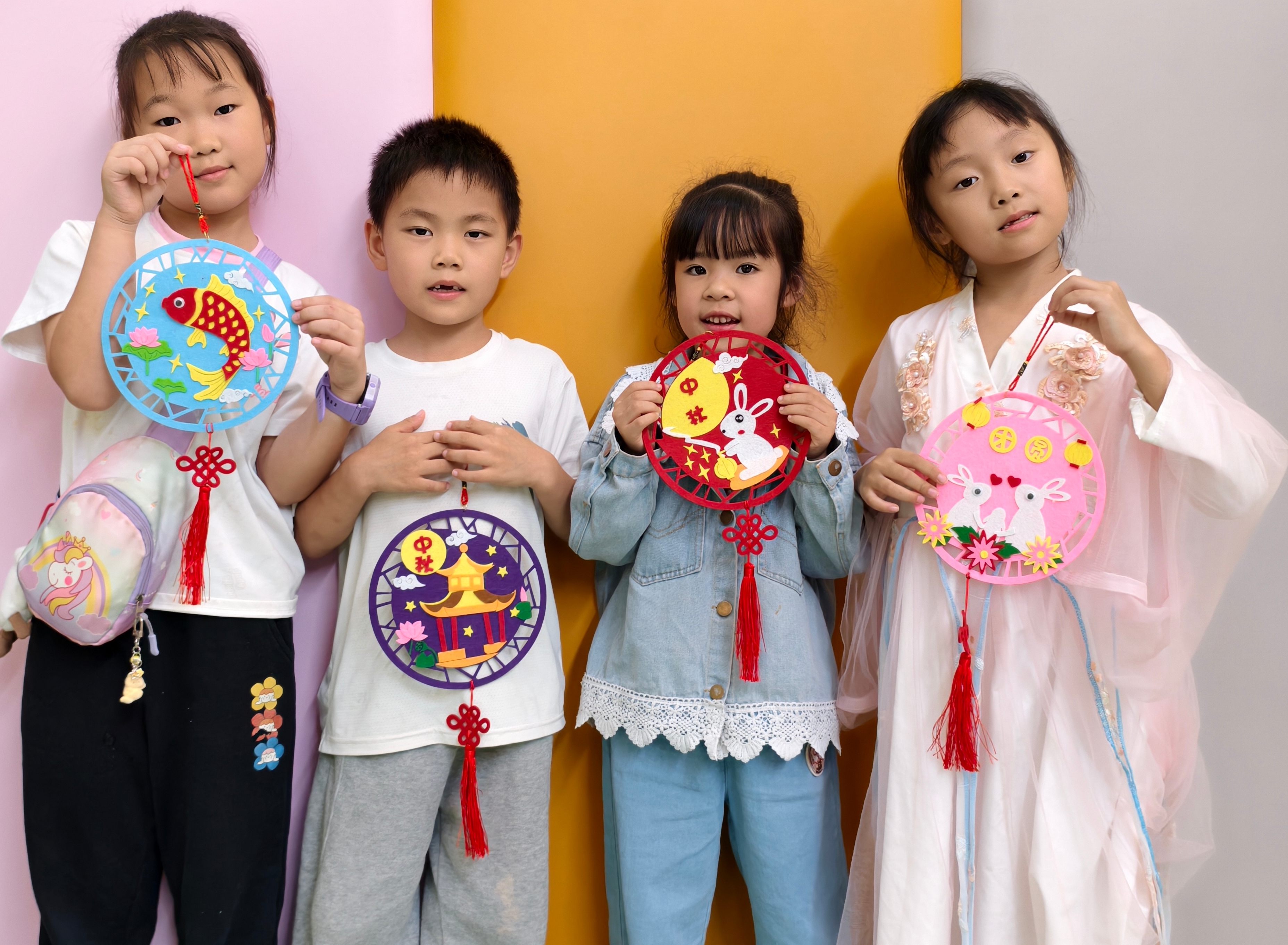 手工创作环节,孩子们用五颜六色的贴布制作了各式各样的中秋元素的手工艺品。