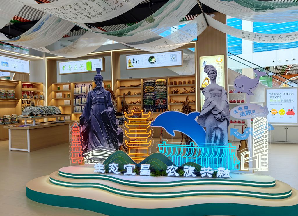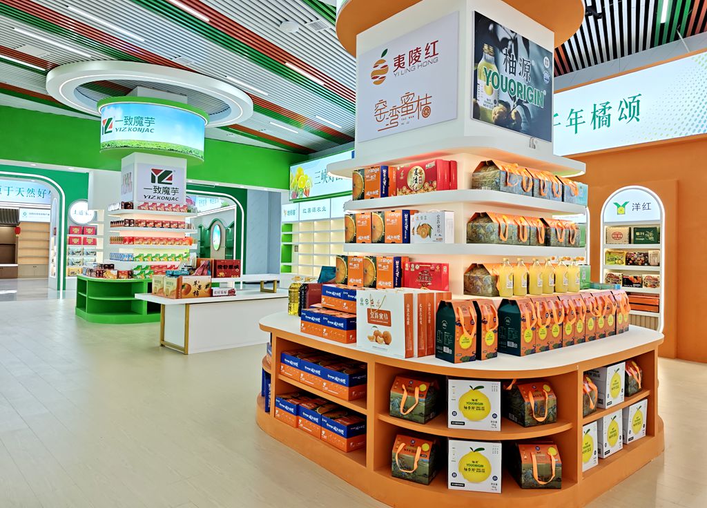 据了解,这座融合了生态与现代的展示展销中心面积约3600㎡,投资200万元,围绕宜昌八大重点农业产业链,规划打造了宜昌特色农产品展销区、宜荆荆恩馆、农旅文创互动体验区等11个特色区域和1个中央大厅。走进特色农产品展销区,夷陵牛、绿秀大米、洋红柑橘与当阳双莲鸡、远安瓦仓大米、秭归脐橙等名优特产琳琅满目,汇聚了宜昌市各县市区的农业精品。