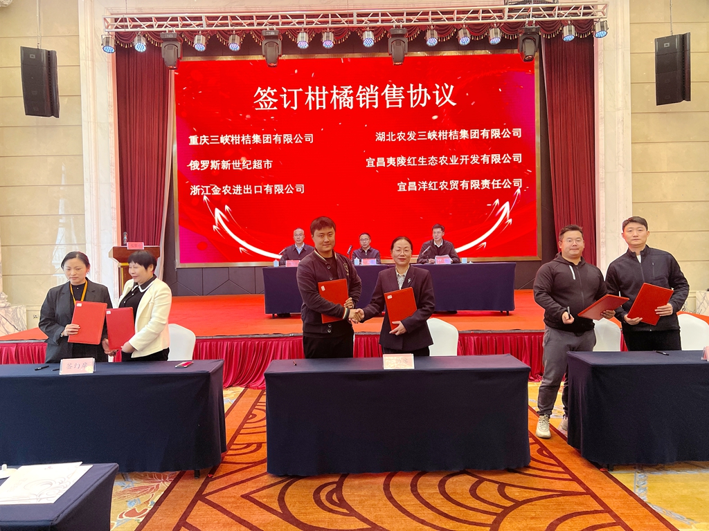 在签约环节,多家夷陵本地柑橘企业与9家外地客商现场签订柑橘销售协议,签约总量6.6万吨,会前签订柑橘销售订单10万吨,合计签订柑橘销售订单16.6万吨,签约金额3.38亿元,为夷陵区柑橘产业持续发展注入了强劲动力。北京新发地悠乐果供应链管理有限公司、牡丹江茂普商贸有限公司、满洲里合利源进出口贸易有限公司等5家客商及企业代表登台发言,点赞夷陵柑橘品质与合作诚意。