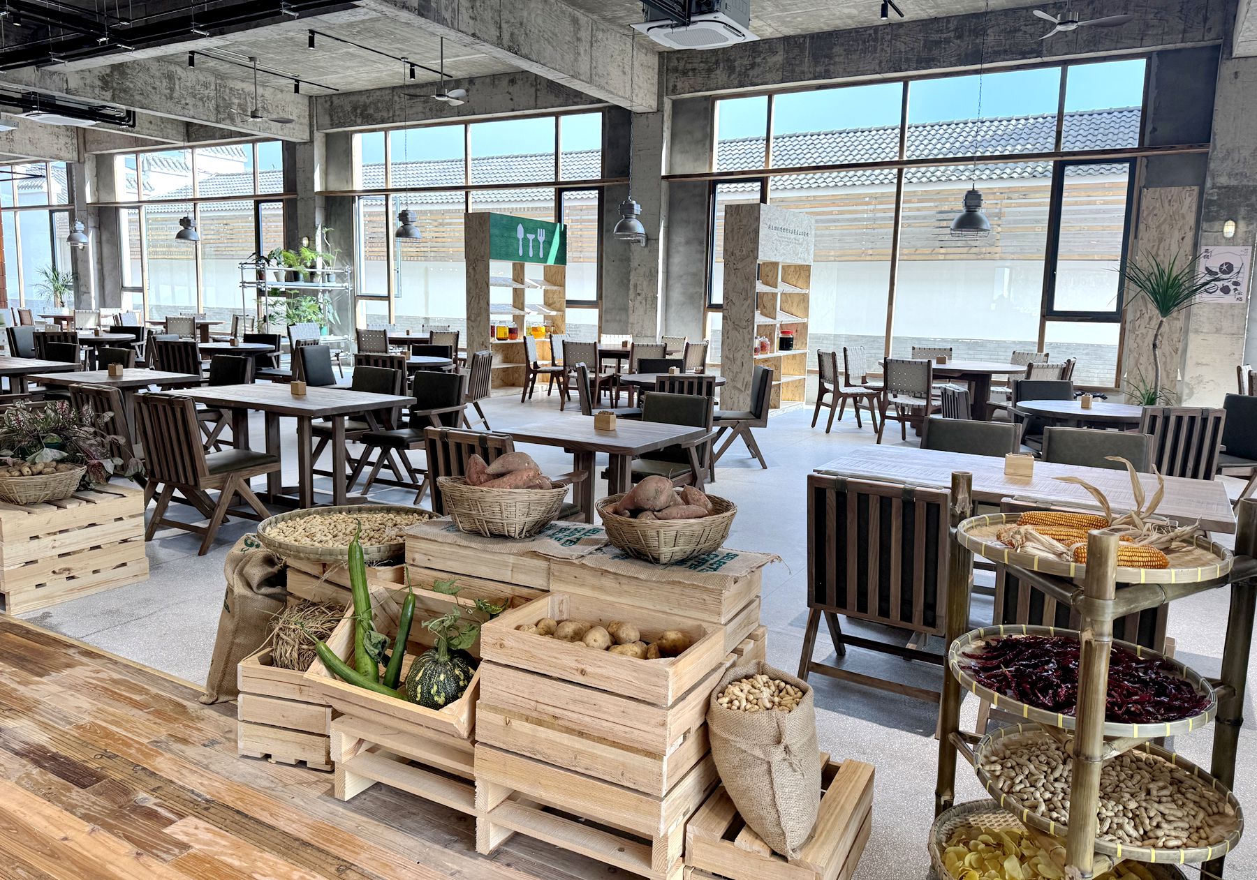 走进嘉馥农场餐饮综合楼,乡村美式风装修独具韵味,田间用具与丰收果实元素点缀其间,营造出自然惬意的氛围。作为农场首期开业的核心板块,餐饮服务坚持“从田间到餐桌零距离”理念,拒绝预制菜,由专业厨师团队将传统农家菜与现代健康餐饮理念相结合,推出农家菜、窑烤面包、乡村咖啡等特色美食,同时提供研学服务,让游客在品味新鲜美味的同时感受农耕文化魅力。
