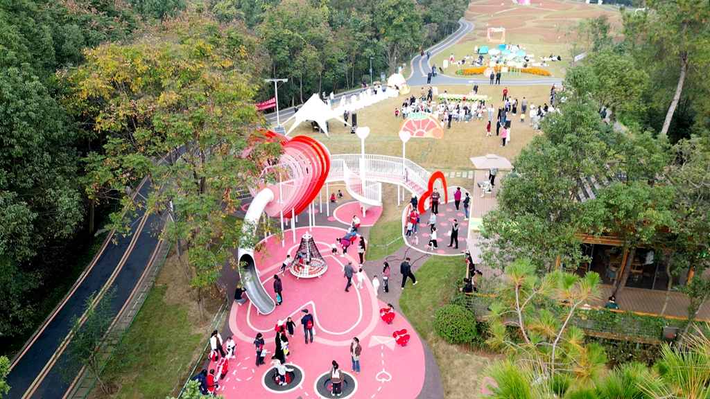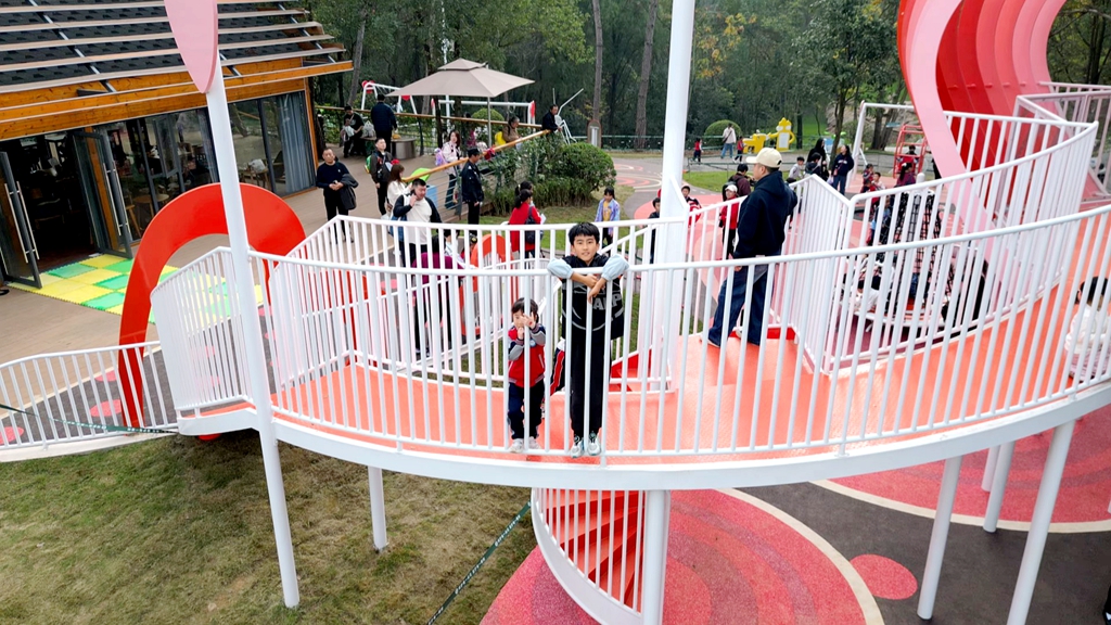 11月21日,在小溪塔森林公园儿童游乐区,以“心形”为设计框架的游乐设施格外引人注目。爱心小屋、螺旋楼梯、网状通道等设计感十足的设施组合在一起,趣味盎然。