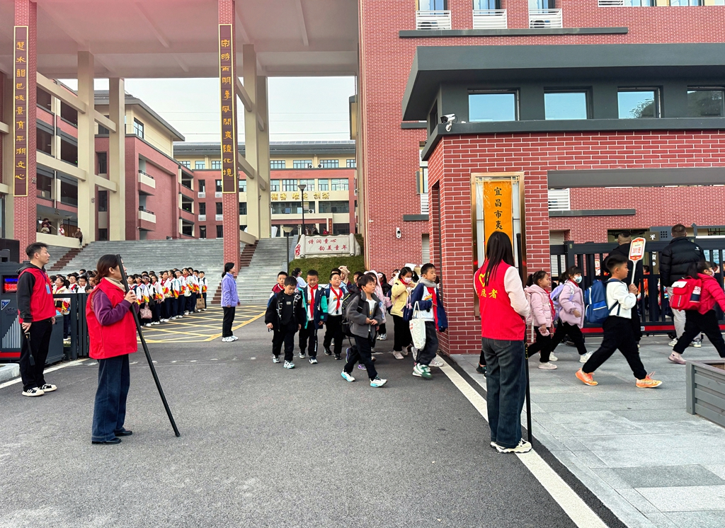 “各位家长,请在等候区有序等待孩子放学!”夷陵区平湖小学门口响起温馨提示。下午4点30分,平湖小学迎来放学高峰,由值周教师、家长志愿者、安保人员、交警、民警组成的“五位一体”护学队伍各司其职,有的引导学生安全过马路,有的协助家长快速接送,原本车流、人流密集的校门口秩序井然。