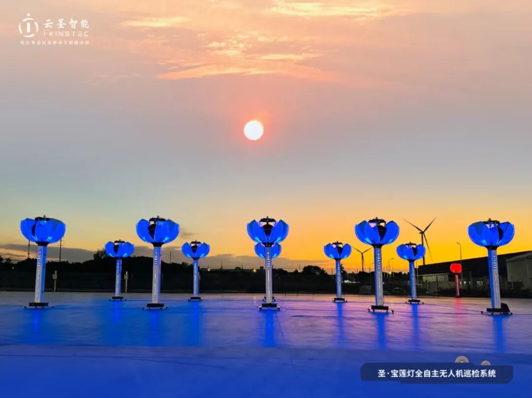 随着莲花状机场缓缓打开,一架无人机从中腾空而起。这是云圣智能自主研发设计的“圣·宝莲灯”全自主无人机巡检系统。