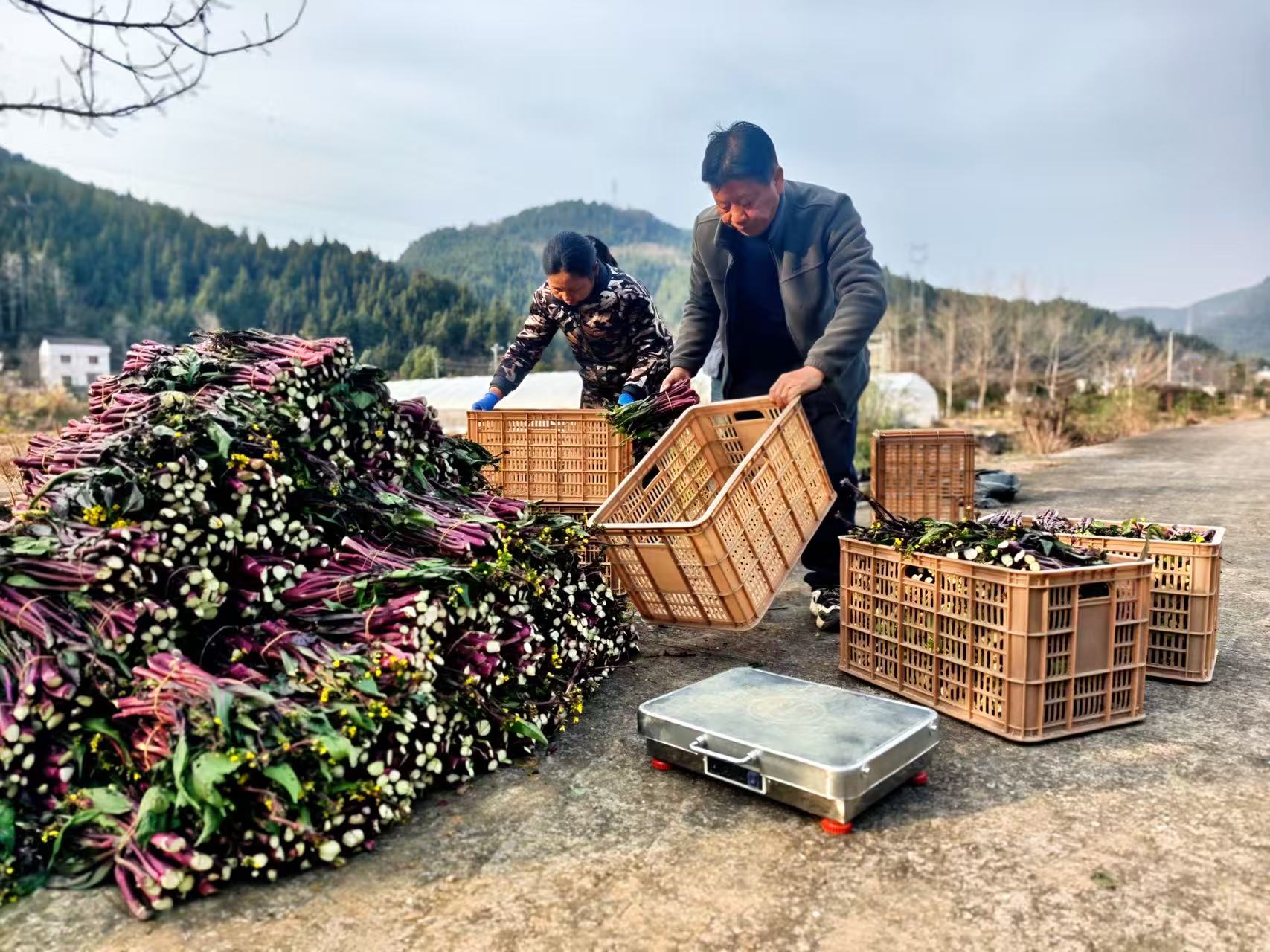 12月17日清晨,薄雾还未散尽,黄花镇上洋村烟农刘祖汉的红菜薹地里已是一派繁忙景象:几名工人弯腰穿梭在红绿菜畦间,麻利地割下带着露水的鲜嫩菜薹,快速捆扎成整齐的小把。一旁的收购商正忙着将捆好的菜薹逐一称重、记账,搬上货车运往外地市场。