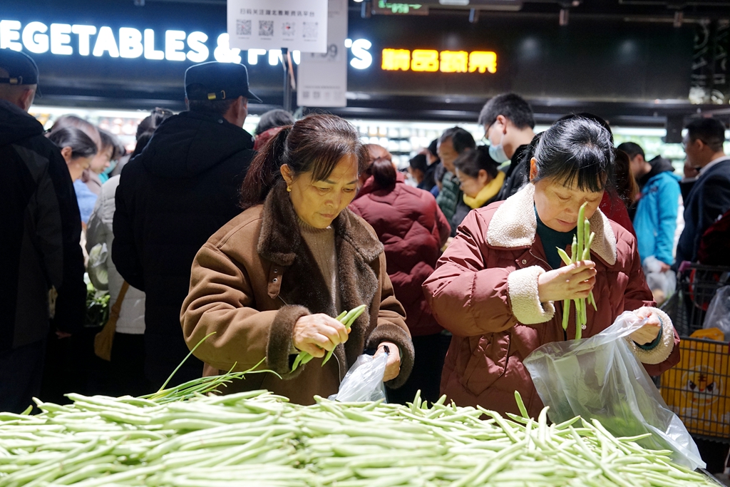 上午8点,超市大门刚刚打开,等候已久的市民便有序涌入,宽敞的卖场瞬间充满了热闹的烟火气。货架上摆满了琳琅满目的商品,从日用品到应季蔬果,从南北干货到特色鲜食,全方位覆盖不同群体需求。市民们推着购物车,仔细比价、挑选。工作人员推着补货车在人群中穿梭,不断为售罄的商品补货。最忙碌的是收银区域,32个收银通道前排起蜿蜒的长队,扫码声、小票打印声、市民的欢笑声交织在一起。