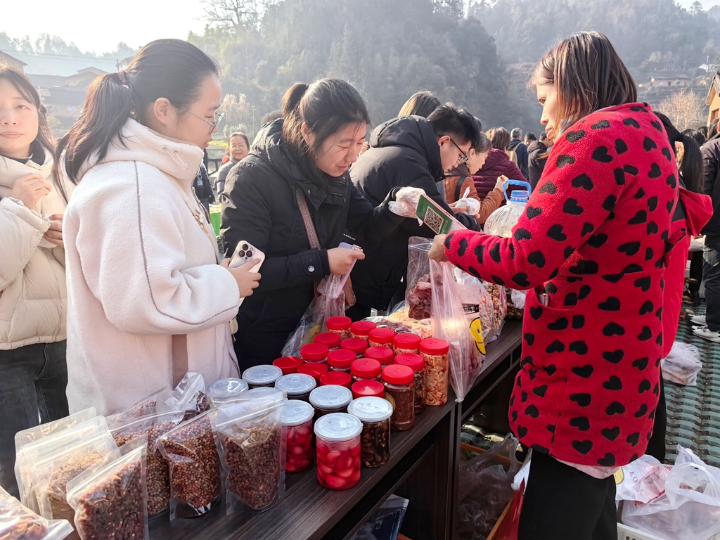 与此同时,一旁的年货展销区人头攒动,成了另一处“打卡”热点。15个展销摊位依次排开,除了雾渡河标志性的优质猕猴桃鲜果及果干、果酒等深加工产品外,土蜂蜜、熏腊肉、新鲜时蔬、自制豆瓣酱、手工红薯粉等本地特色农产品琳琅满目,吸引了众多市民争相选购。来自西陵区的张女士手里已经提了好几个袋子,她高兴地说:“这里的东西又新鲜又有特色,价格也实在。我买了猕猴桃、土鸡蛋,还准备带点腊肉回去,都是纯正的农家味,过年招待客人最好不过了!”摊主们忙得不亦乐乎,脸上洋溢着丰收的喜悦。