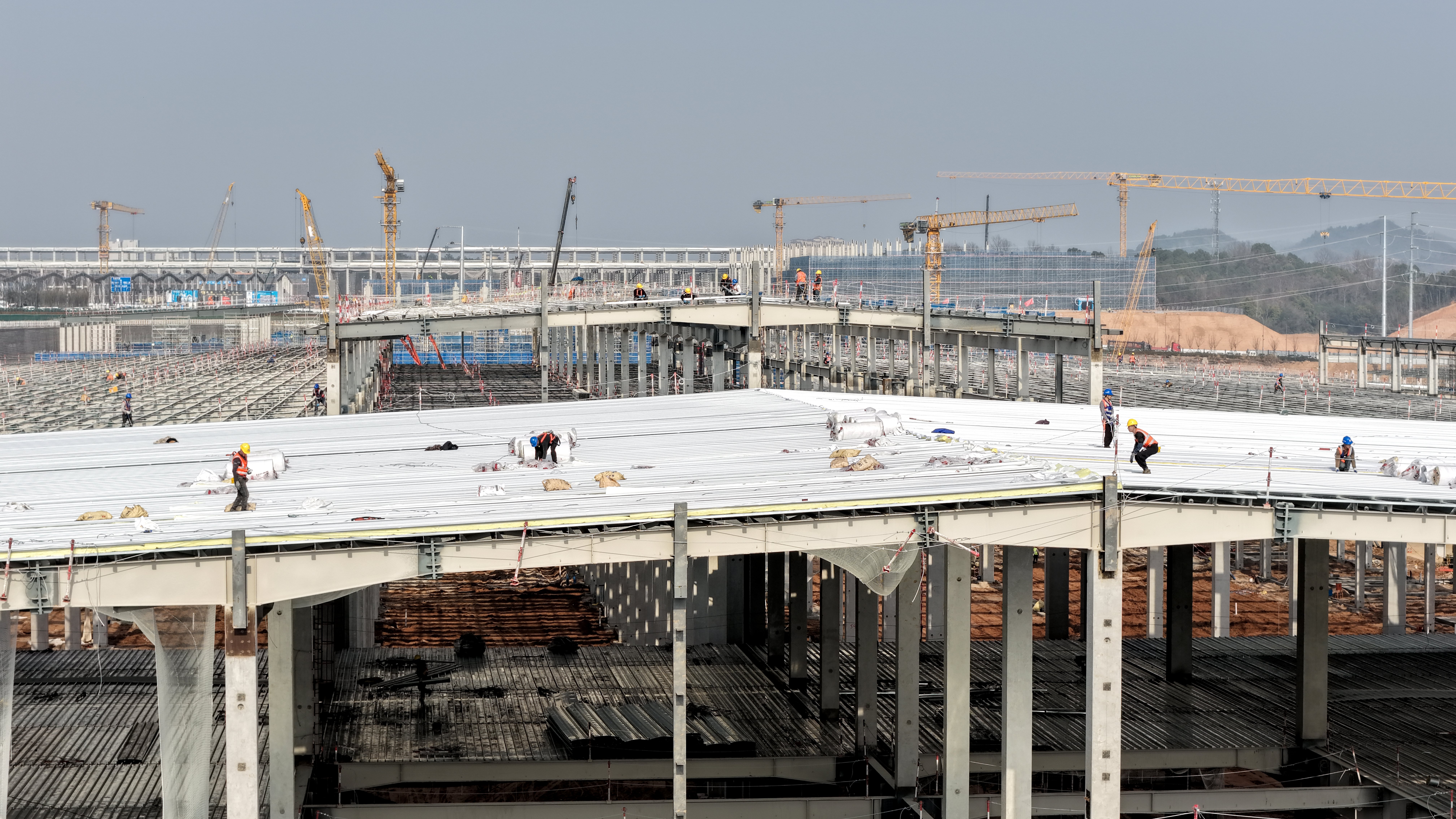 随着一批批钢结构安装就位,屋面板施工已经进入高潮。站在即将合拢的屋顶上,工人们正在进行防水层铺设。“接下来,我们会继续保持这份干劲,严把质量关、安全关,以更高标准、更快速度推进项目建设,确保2月6日实现项目主体结构全面封顶。同时,项目全体员工也会在春节期间坚守岗位,为项目早日建成提供有力支撑。”中建三局项目片区经理魏恒表示。
