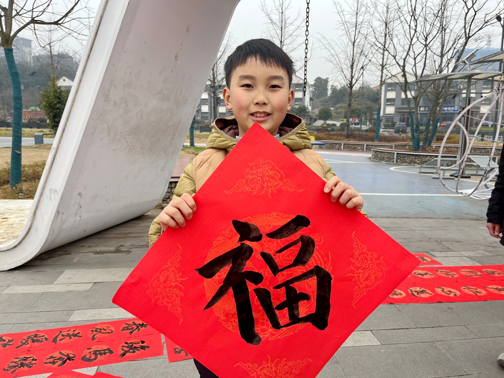 刚上五年级的小学生胡君浩对书法颇为爱好,现场也体验写了一个福字,他说:“现场看老师们写字笔锋有劲,很是羡慕,也希望自己好好学习书法,弘扬中国传统文化。”