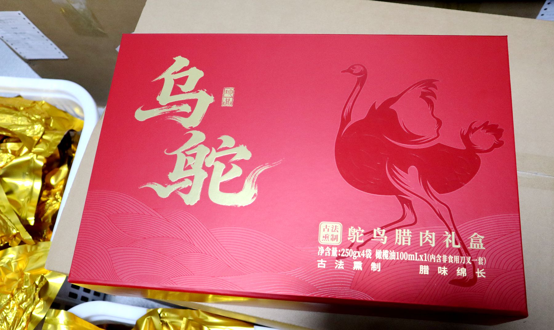 随着养殖技术成熟,文金华开始推动产业升级。除了销售鲜肉,团队还逐步开发出鸵鸟肉卷、肉串等初加工产品。今年春节前,他们创新推出“鸵鸟腊肉礼盒”,以其差异化健康特色打开市场,受到消费者欢迎。