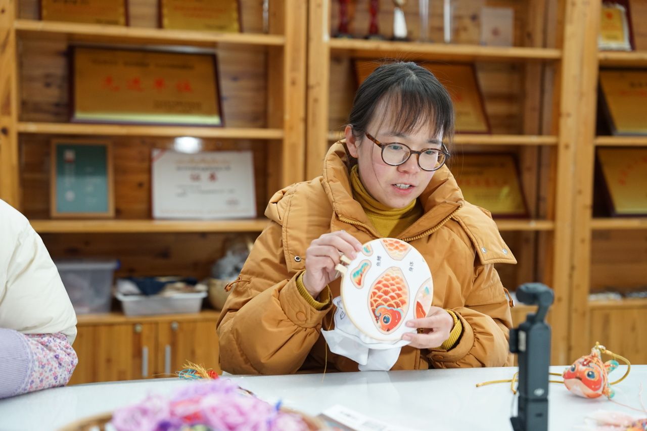 绣坊中央,陈娅雯正在直播,只见她指尖轻捻,绣绷上的锦鲤仿佛随着她的动作游动。