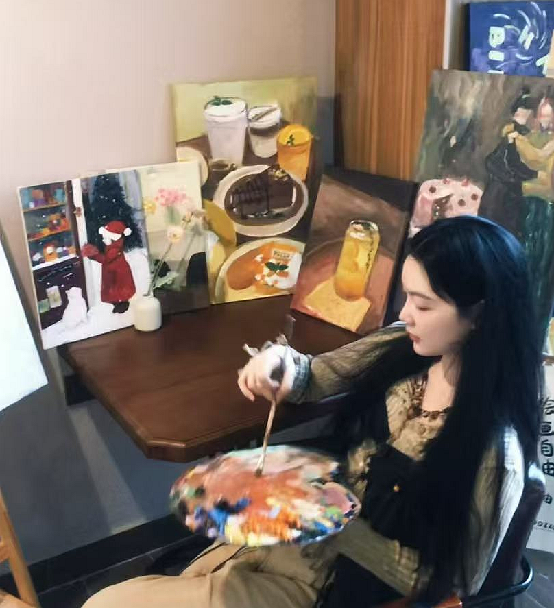 温馨的店内,数量不少的油画也是一大亮点,这些油画从风景画到动作肖像到物品写真,种类多样,颇具特色,代小姐介绍,画油画也是她的喜好之一,各种不同内容的油画,更是能为店里添上一抹亮色,也为前来打卡拍照的年轻人增加了一个打卡亮点。