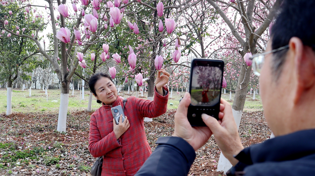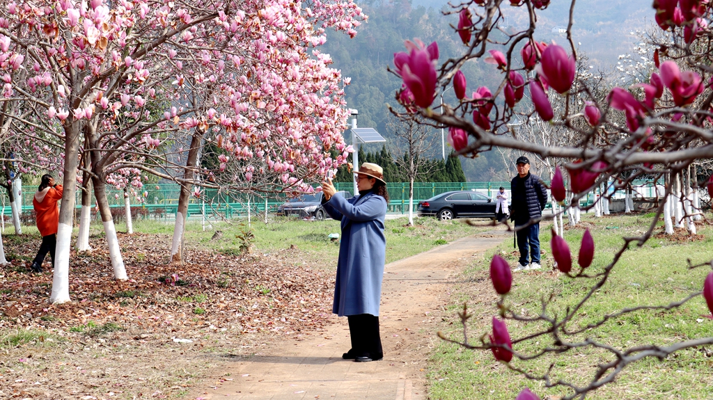 峡江边,成片玉兰花迎风盛放,洁白素雅、美不胜收,成为沿线热门打卡点。游客李开凤夫妇特意驾车折返,驻足拍照留念:“这片玉兰花太美了,开车经过都舍不得走,必须掉头回来打卡拍照。”