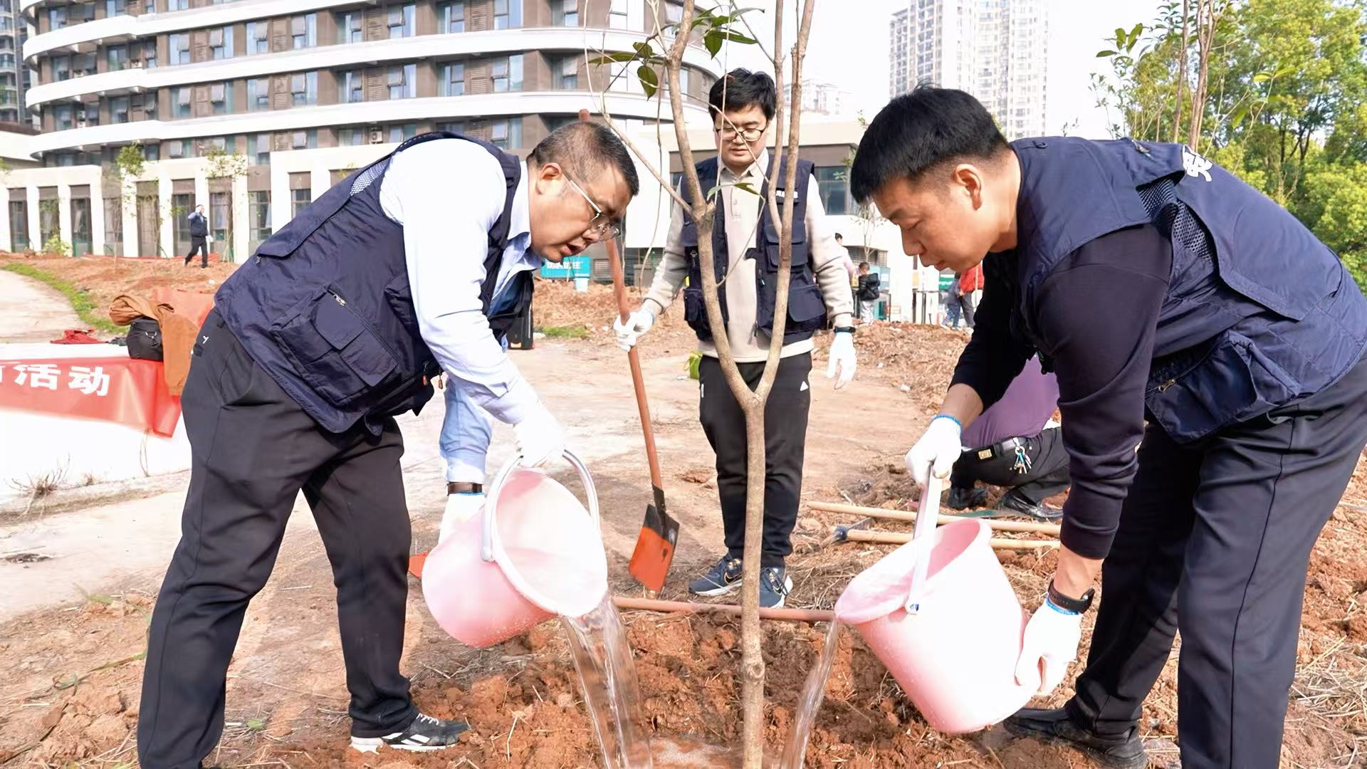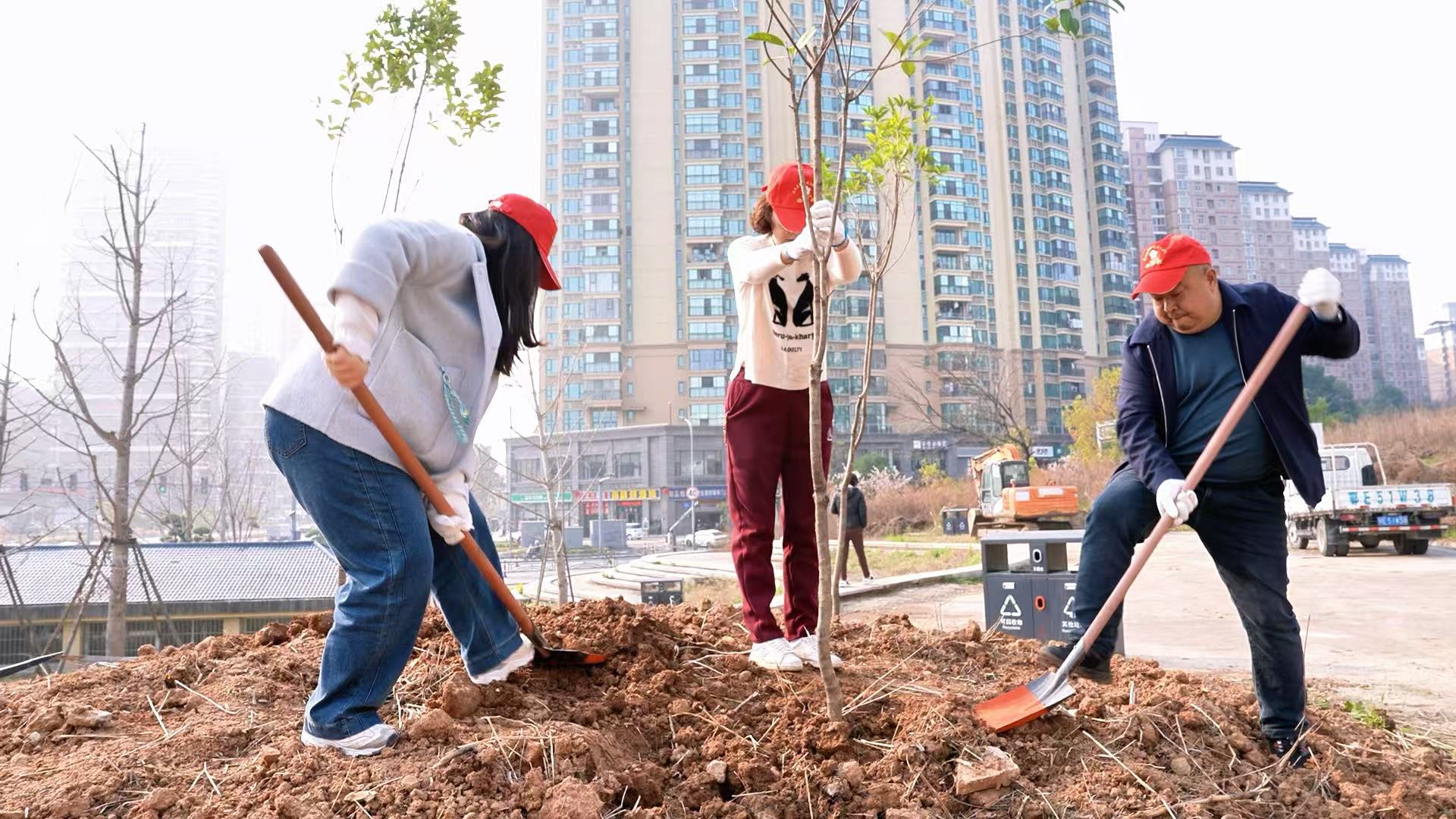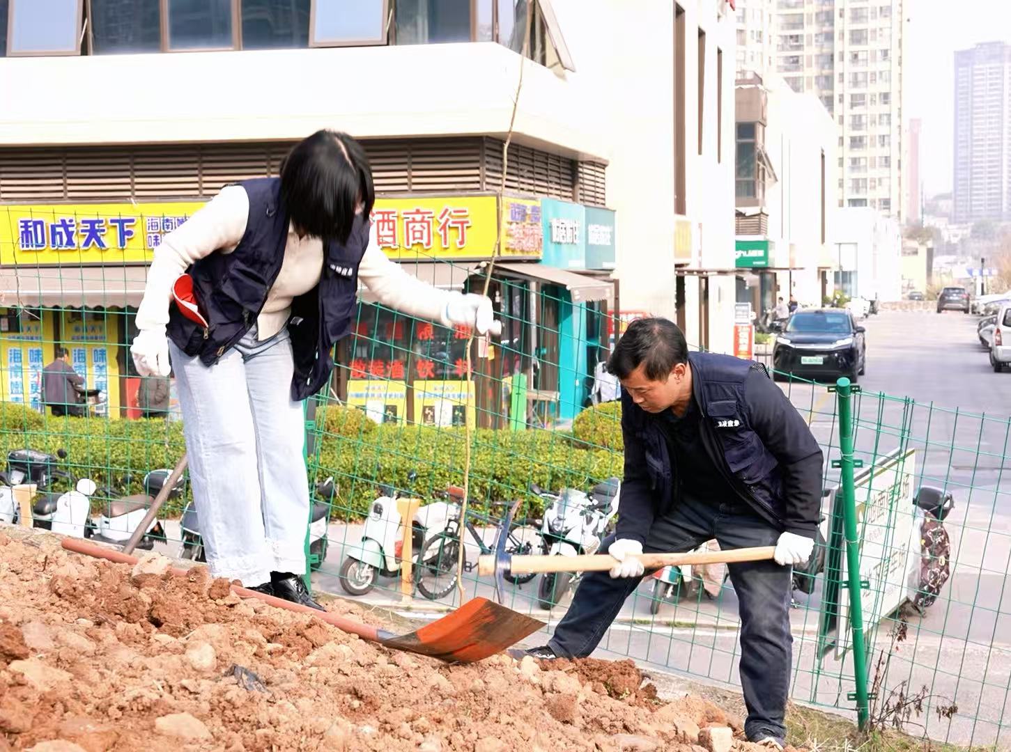 在黄金卡社区晨光公园,大家三人一组、五人一队,男女搭配、分工协作,挥锹铲土、定点挖坑、扶正树苗、培实新土。经过两个多小时的辛勤劳作,180余株桂花树和紫薇树在晨光公园“安家落户”,新栽的树苗迎风挺立,为原本空旷的土地披上了崭新绿装。