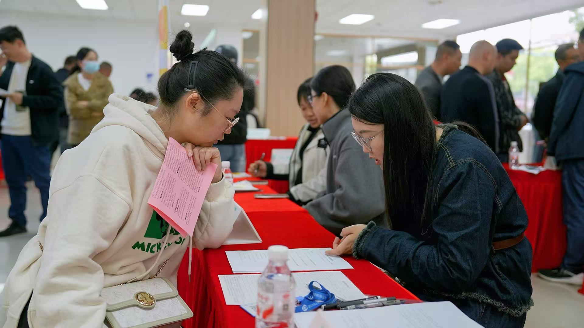 走进招聘会场,咨询台前围满了前来求职的群众,求职者手持简历穿梭于各展位之间,认真查看岗位信息、详细咨询薪资待遇;企业招聘专员耐心答疑、细致讲解,政策服务窗口同步开展就业扶持、技能培训、社保维权等宣传,现场秩序井然、氛围热烈。