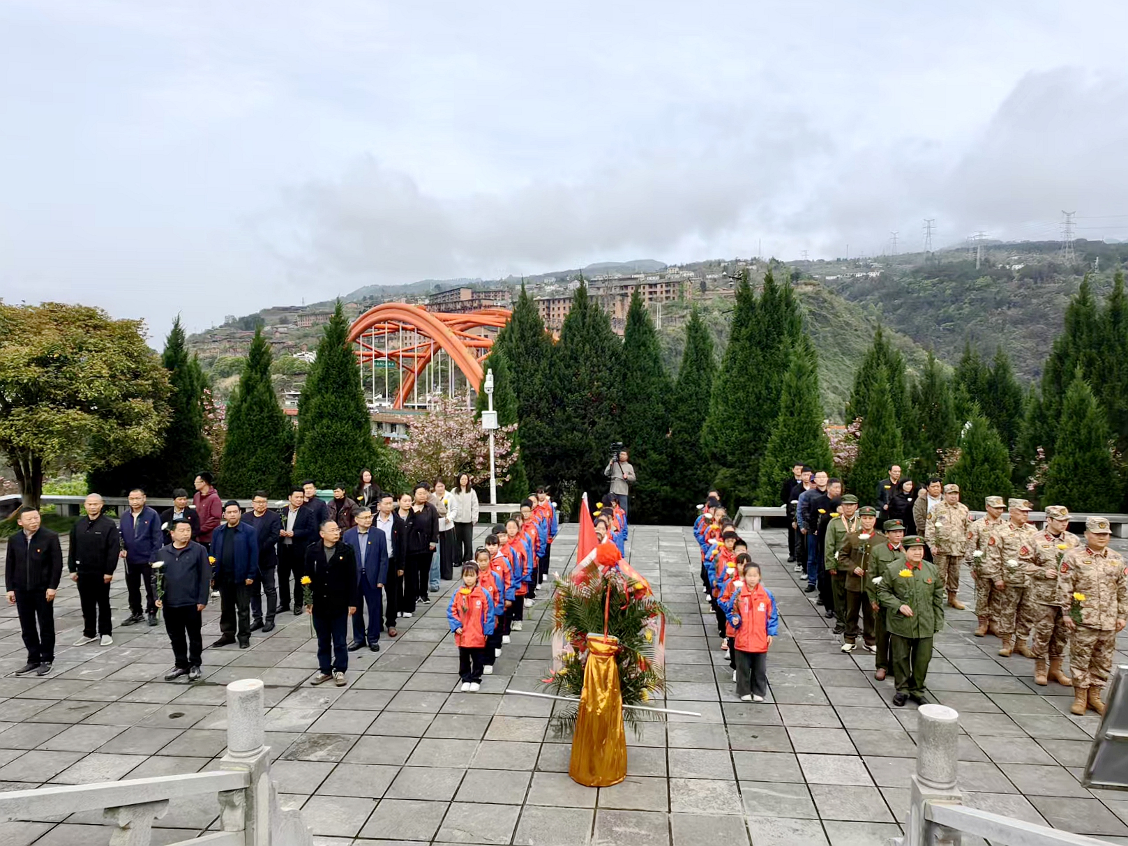 上午9时30分,莲沱“九四”革命烈士纪念碑前松柏苍翠、庄严肃穆。全体人员整齐列队,向长眠于此的革命先烈默哀一分钟。来自三峡小学的40名少先队员献唱《我们是共产主义接班人》,稚嫩而坚定的歌声在纪念碑上空回荡。