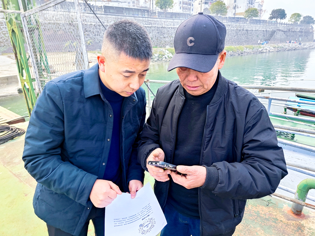 1月10日清晨,江面上薄雾蒙蒙,夷陵区交通运输局和港航建设养护中心的工作人员早早来到黛狮农用船集中停靠点,准备为这里的船主宣传安装“夷陵船管”小程序。