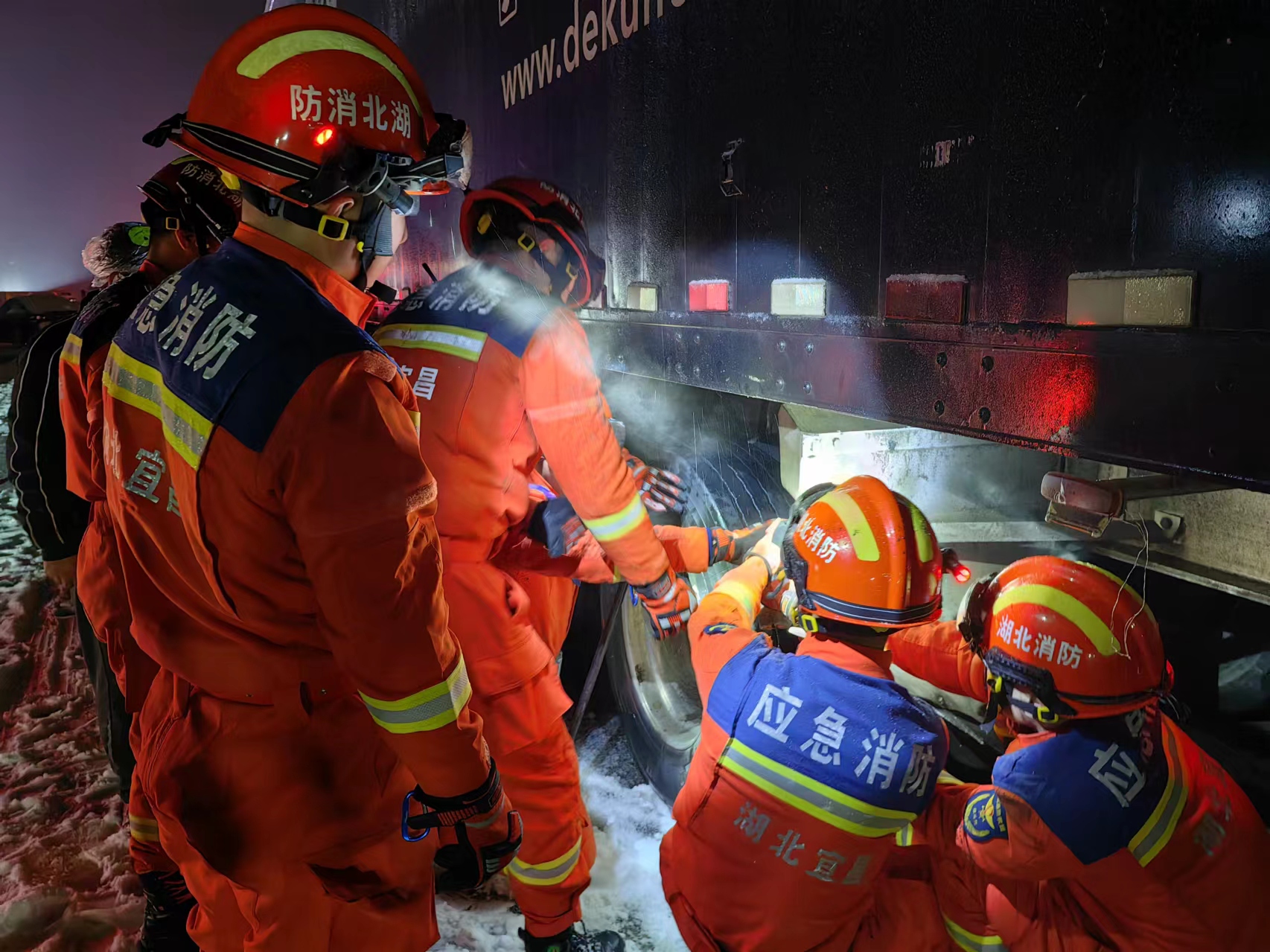 2月3日凌晨1点12分,夷陵区消防救援大队接到报警,宜昌段沪蓉高速往重庆方向因突降暴雪导致多车相撞,1人被困,接警后,夷陵大队立即调派罗河路消防救援站1车6人前往救援。