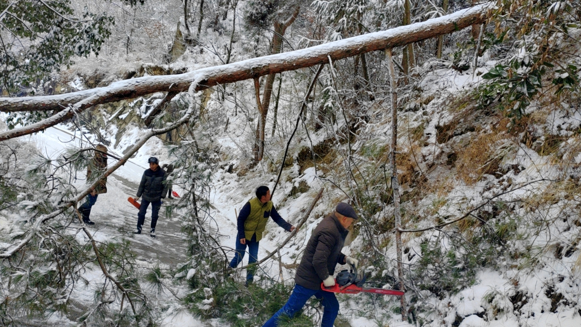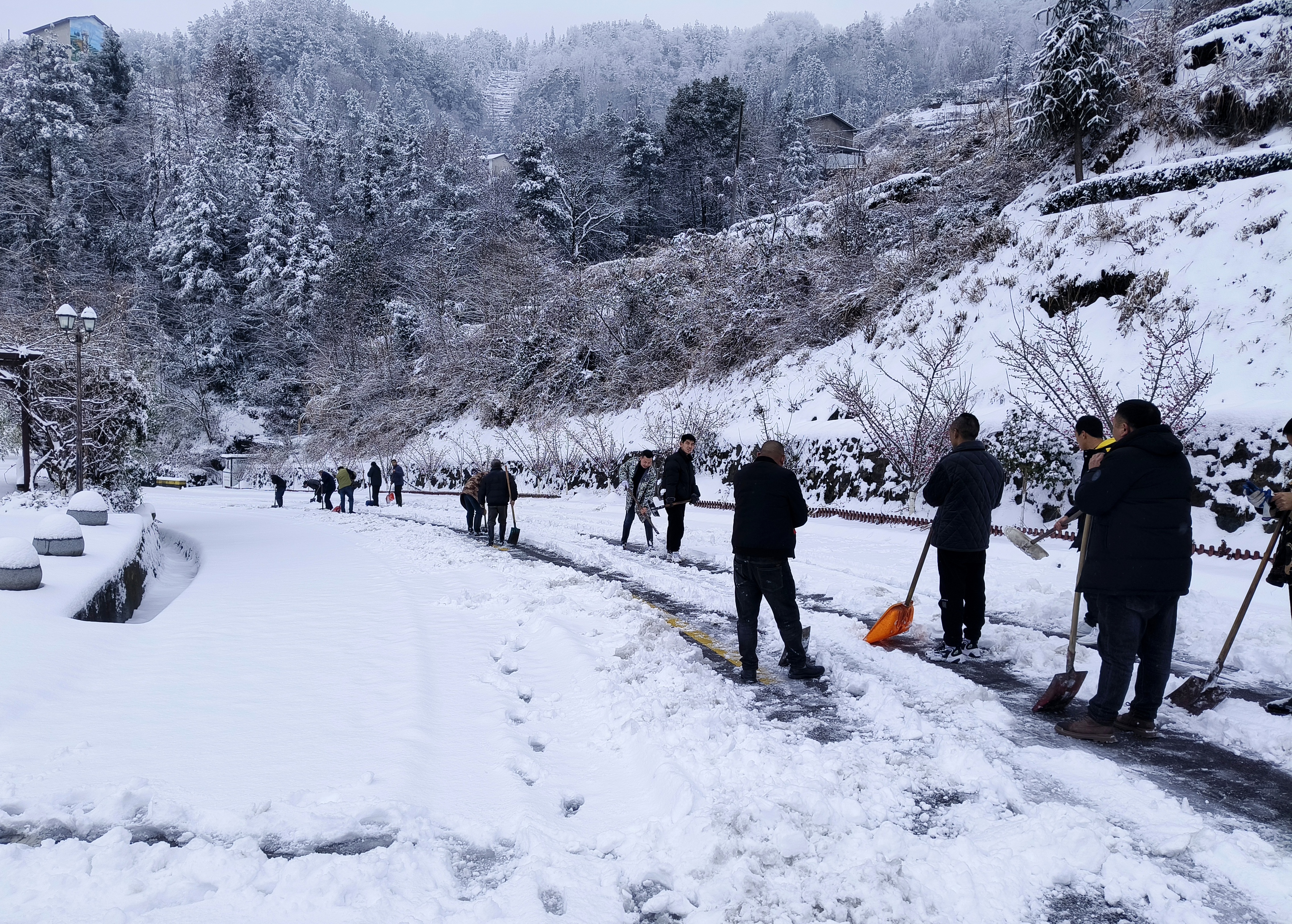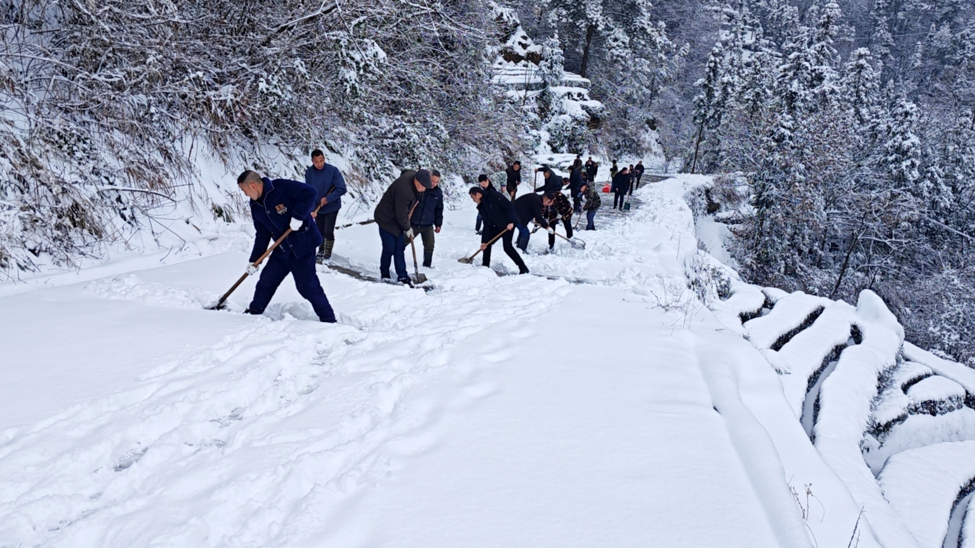 2月4日,夷陵区太平溪镇古村坪村,一群由30余名村干部、村民组成的义务除雪队正在村内院古路上热火朝天地清理积雪。