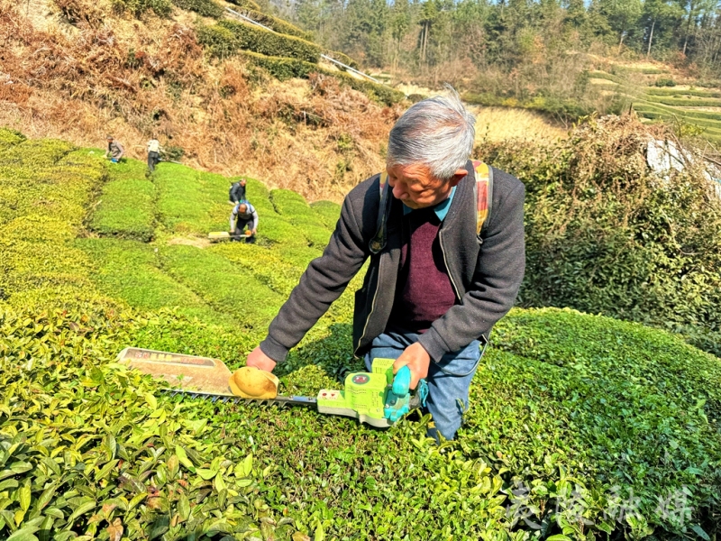 为了保证春茶的品质,服务队修剪得特别仔细。“第一要轻修剪,不能剪重了,剪重了过后,对今年茶叶的芽头有影响;第二要保持茶叶修平,不然影响茶叶的采摘质量。”对于茶叶修剪,邓村坪村民、同时也是服务队队员的胡学文颇有心得。