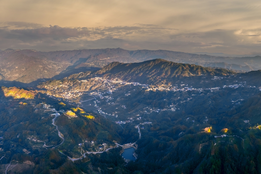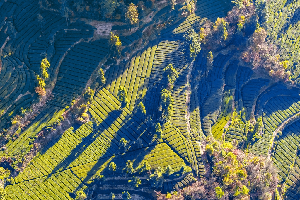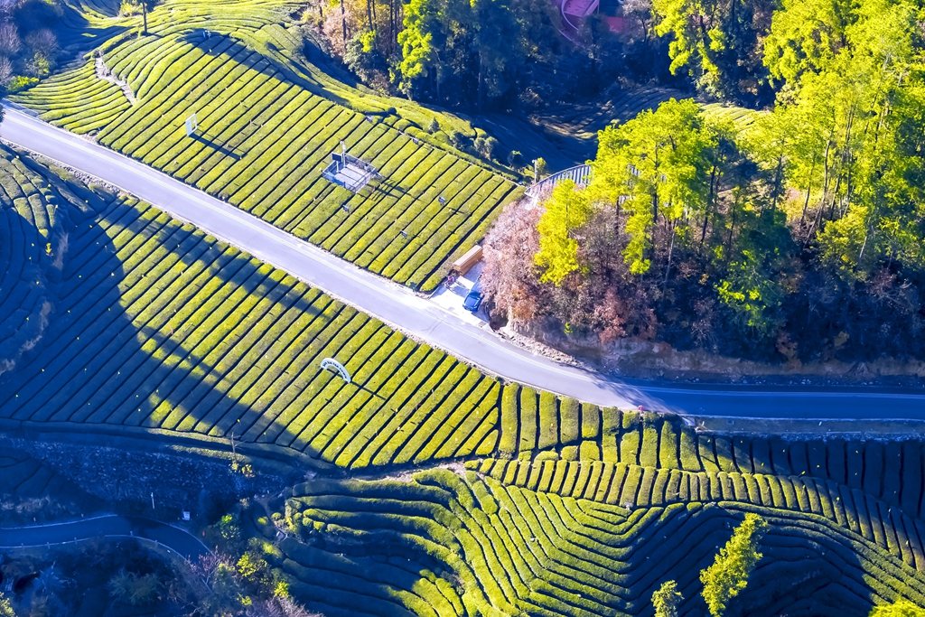 航拍镜头下,梯田茶园的流畅肌理与山林的斑斓色彩完美融合,光影流转间,茶园与生态林间形成清晰的三角形、多边形明暗轮廓,明暗交错中更显壮阔灵动。摄影爱好者们穿梭在茶垄间、驻足于山顶观景台,捕捉光影变幻下的茶园之美,快门声此起彼伏,定格下秋冬茶园的独特韵味。