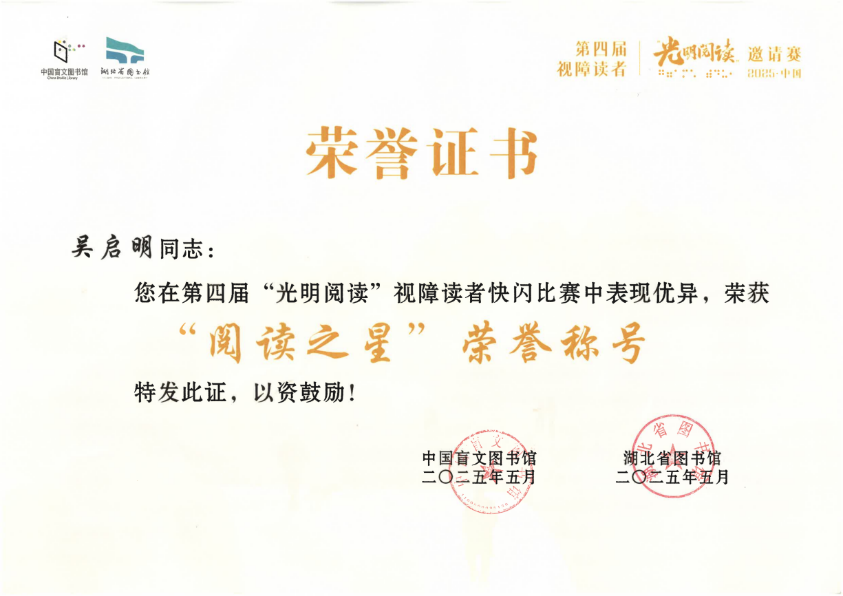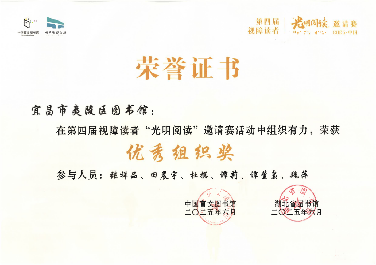 近日,由湖北省文化和旅游厅、湖北省残疾人联合会指导,中国盲文图书馆、湖北省图书馆联合主办的第四届“光明阅读”视障读者快闪赛落下帷幕。夷陵区图书馆荣获“优秀组织奖”,夷陵区视障读者吴启明荣获“阅读之星”荣誉称号。