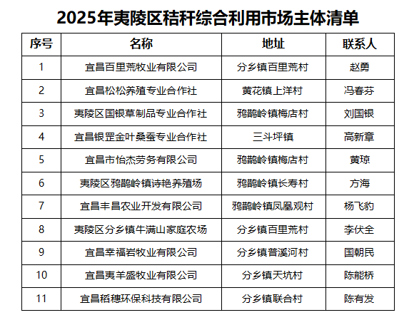 为了确保夷陵区可利用的秸秆资源应收尽收、充分利用,现将11家市场主体进行公布,有需要的农户可以联系市场主体回收秸秆。