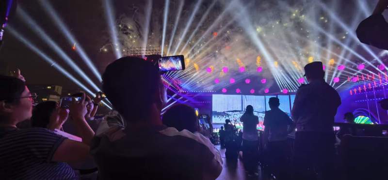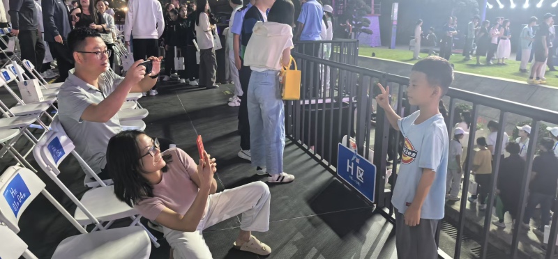 当最后一束烟花缓缓消散,演出落下帷幕,人群开始有序退场。就在此时,孩子的妈妈快速占据c位,笑着举起手机,镜头对准孩子还带着惊叹的笑脸。几乎同一瞬间,父亲也再次举起手机,两人相视一笑,没有言语,却默契地同时按下快门——一个被爱包围的孩子,两张记录幸福的笑脸,构成了这个夜晚最温暖的画面。