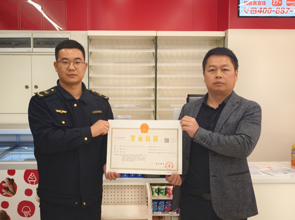 在得知商户郑家剑计划在站前广场开办便利店的消息后,专班工作人员立即主动对接,启动“全程帮办+送证上门”服务模式,手把手指导其准备登记材料,提前核查经营场所条件,同步告知后续经营所需遵守的规范要求,避免商户走弯路。针对北站片区经营场所装修进度紧、商户时间宝贵的实际情况,该局优化内部审批流程,将材料审核、现场核查等环节压缩至1个工作日内完成,审批通过后第一时间制作证照,并安排专人上门送达,真正实现了商户“零跑腿”办证。
