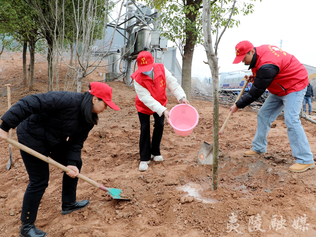植树活动现场,干部职工们挥锹铲土、扶直树苗、培实新土、提桶浇水,每道工序都做得有条不紊。大家齐心协力共栽植玉兰、海棠、榉树等苗木300株。一棵棵树苗傲然风中舒展新绿,将原本荒芜的黄土裸露地点缀得生机勃勃、绿意盎然,掀起了2024年度夷陵造林绿化和绚丽花城建设高潮。