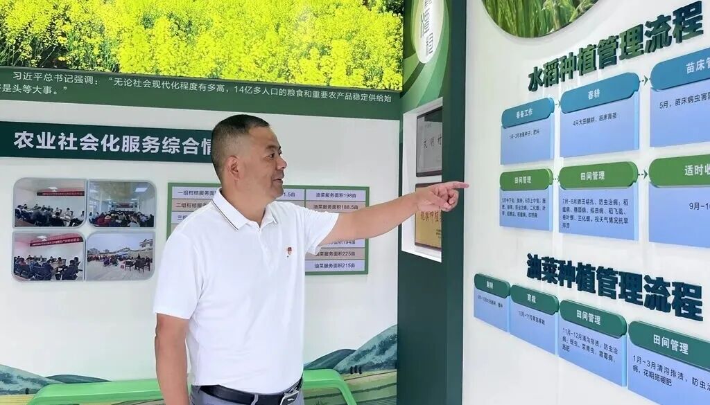 建强实体阵地。农业社会化服务中心既是成果展示平台,更是技术培训阵地。中心清晰展示柑桔、水稻、油菜全年种植管理流程图,设立农业技术图书角和政策宣传栏,方便农户随时查阅学习,提升了农民的科学种田水平。