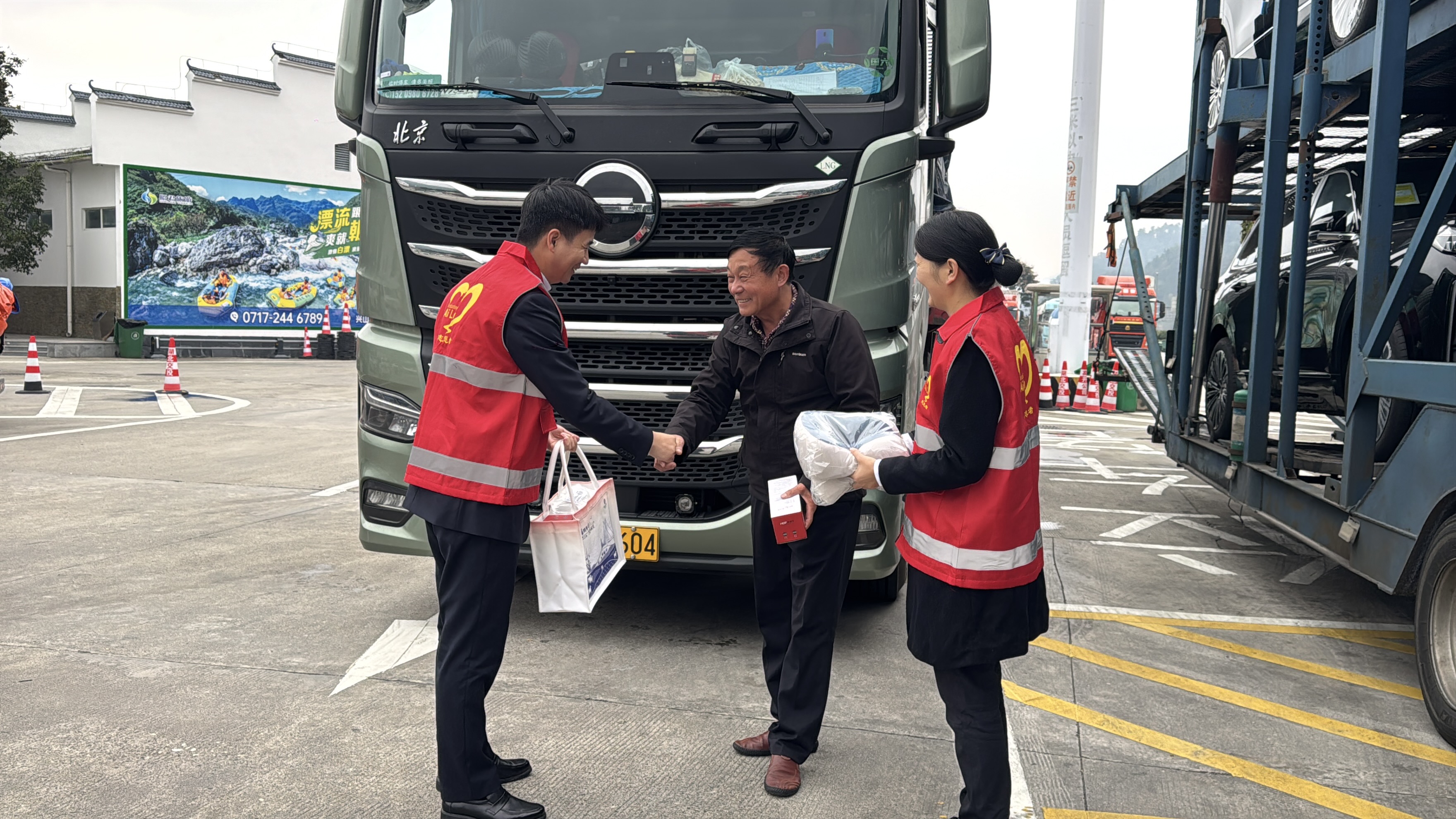 活动期间,工作人员在各重点服务点位精心搭建便民服务台,“爱路-AiLu”志愿服务队的志愿者们主动上前,与货运司机面对面交流,细致宣讲湖北省内差异化收费政策及适用路段、鲜活农产品运输“绿通”政策等核心内容,还结合实际案例帮助司机们理解政策红利。除此之外,志愿者们还为货运司机们送上精心准备的暖心“加油包”,包内装有保温杯、U型枕、车辆应急包等实用物品,每一件物品都饱含着对货运司机的关怀。