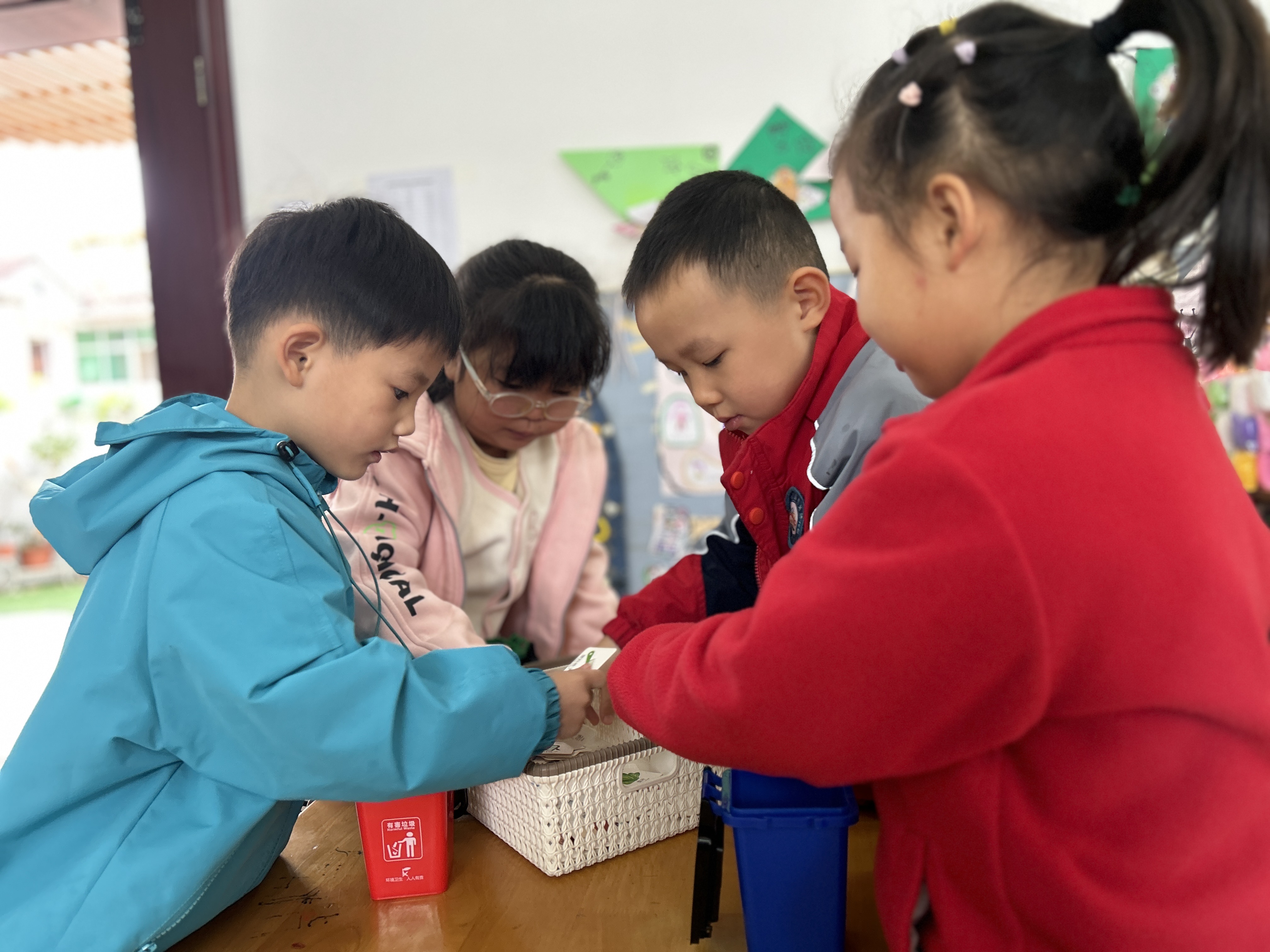 老师还在活动区准备了各种代表不同垃圾的实物图片或模型,孩子们自发玩起了“垃圾分类”游戏。他们仔细辨认着手中的“垃圾”,思考着它应该放到哪个颜色的“家”里。