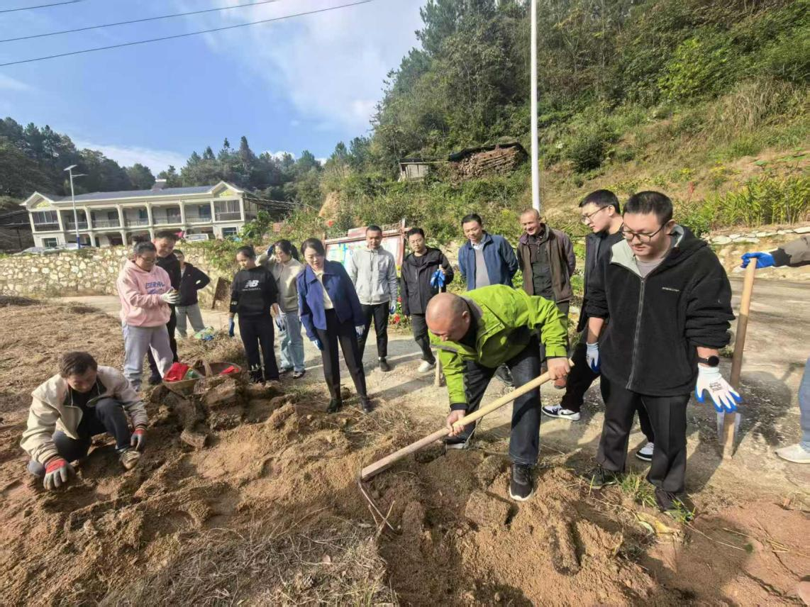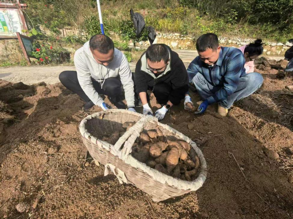 活动中,青年干部们戴上手套,拿起锄头、挎起竹篓,在基地技术员的带领下,化身“麻农”,认真学习“轻刨浅挖”的采收技巧。