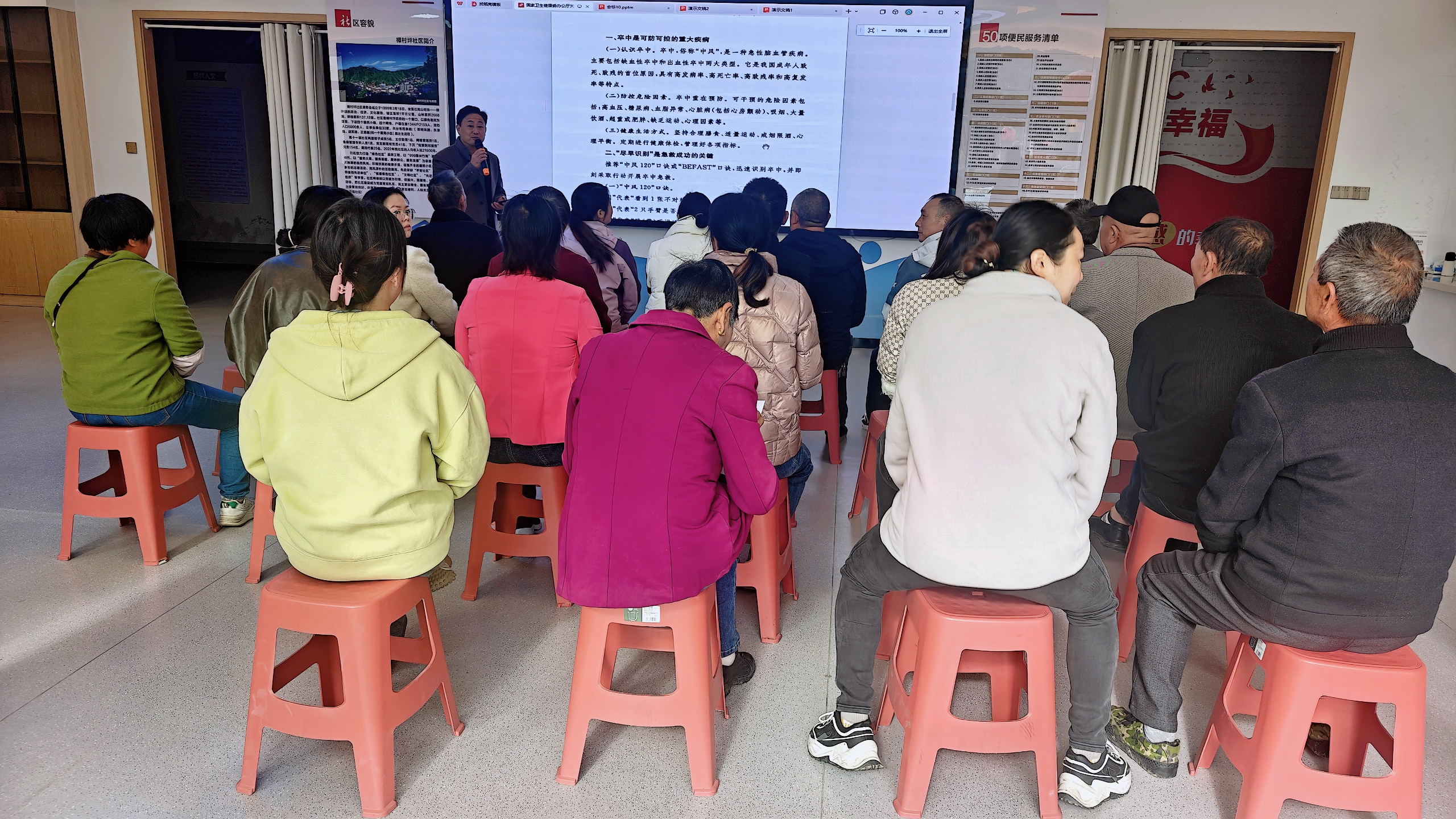 讲座现场,辖区老年居民和工作人员齐聚一堂,认真聆听讲解。医生用“脸不正、臂不平、语不灵”等通俗易懂的语言,耐心讲解卒中早期识别技巧,反复强调“时间就是大脑,时间就是生命”的急救理念,引导大家在发现疑似症状时第一时间拨打急救电话。