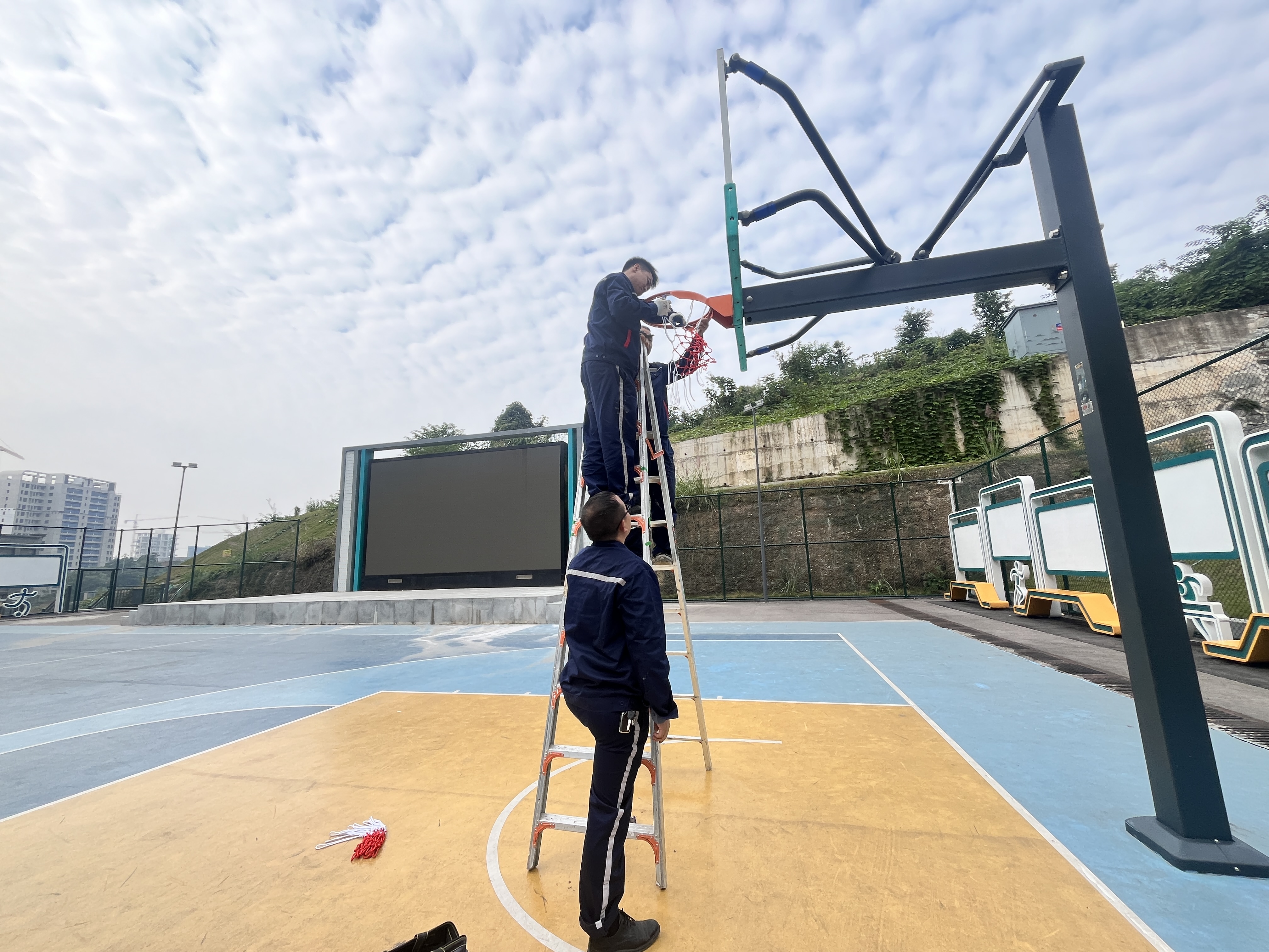 此前,有居民通过居民群反馈,广场篮球架上的篮球网因长期使用,出现了网绳断裂、边缘磨损老化等情况,不仅影响投篮体验,断裂的绳头还存在勾挂衣物的安全隐患。社区收到反馈后,第一时间安排工作人员现场查看,迅速采购了耐用的尼龙材质篮球网,并组织维修人员开展更换工作。更换过程中,工作人员仔细拆除旧网,逐一检查篮球架篮圈的稳固性,确保无松动、无锈蚀后,再将新网平整安装、牢固固定,避免使用中出现脱落情况。不到1小时,2个篮球架全部换上了崭新的篮球网,红白相间的新篮球网在阳光下格外醒目,让整个篮球场焕发出新活力。
