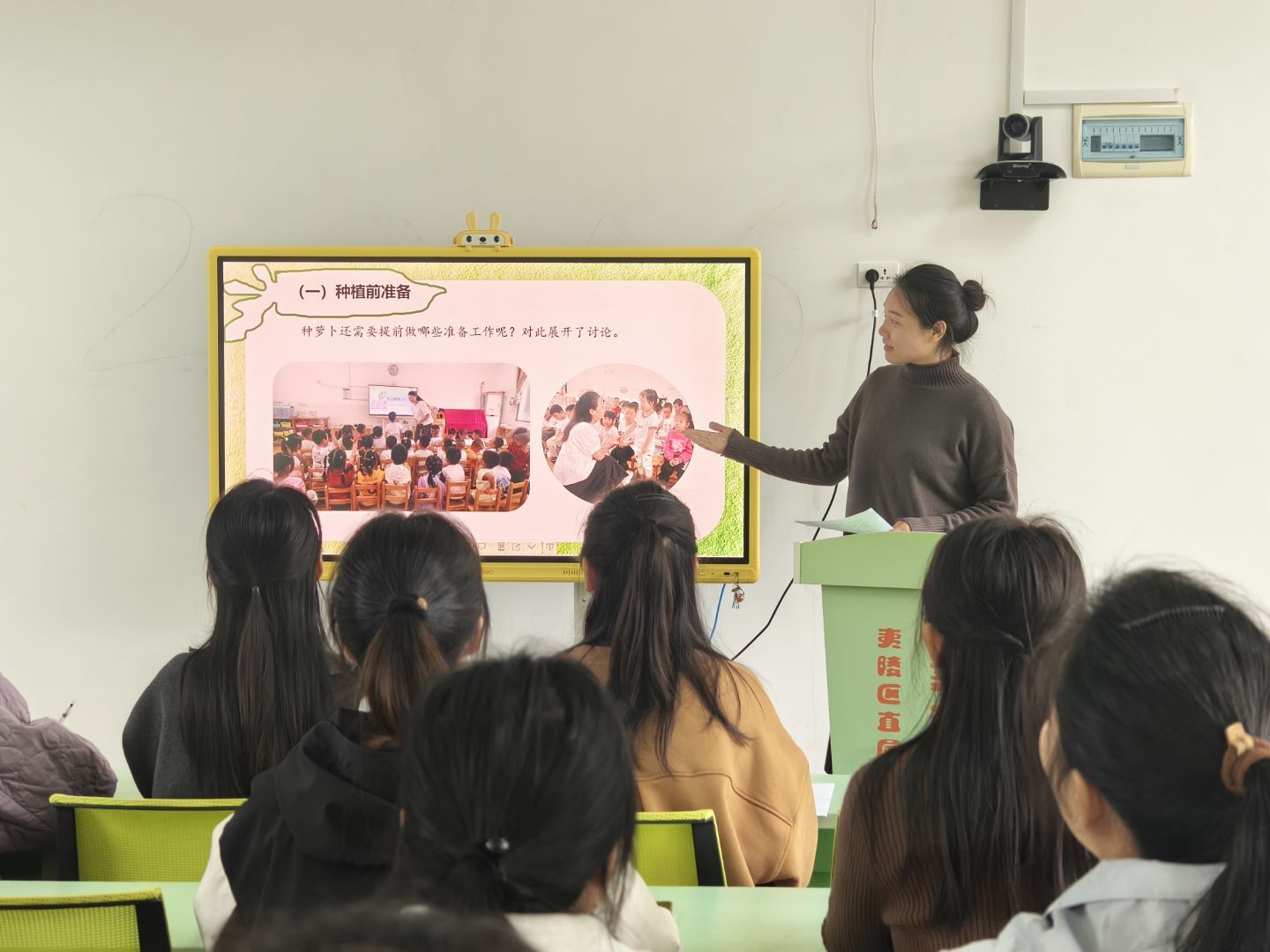 本次比赛以“儿童视角、真实过程、教育思考”为核心评审标准,教师们围绕幼儿的兴趣探索、游戏活动、生活体验等主题,将课程实施中的点滴转化为生动故事。雾渡河分园教师章青林以“萝卜种植记”为主题,细腻讲述幼儿从挑选种子、翻土播种,到日常浇水、观察生长,制作美食的探究之旅;下堡坪分园教师郑盼盼聚焦“小抹布大本领”,用生活化的小事呈现幼儿解决问题的思维过程;樟村坪分园教师方燕妮以“测量游戏”为切入点,凸显幼儿在自主探索中对数学概念的初步感知。赛后,评委们肯定了教师对课程细节的关注,同时也提出了“深化儿童观察、加强课程反思”的建议。