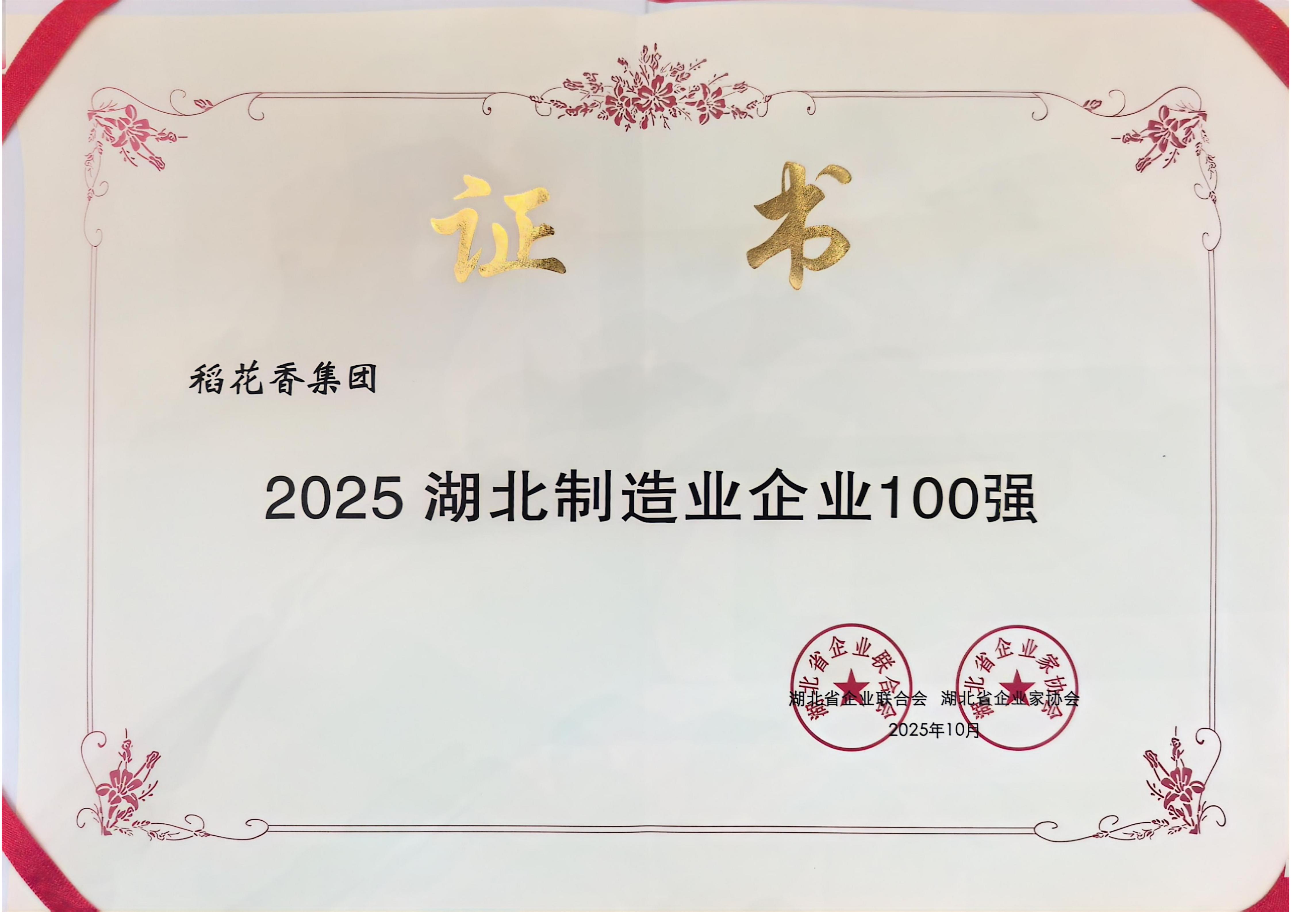 10月30日,湖北省企业联合会、湖北省企业家协会在武汉发布“2025湖北企业三项100强”名单,稻花香集团蝉联榜单,位列2025湖北企业100强第15位、2025湖北制造业企业100强第3位。