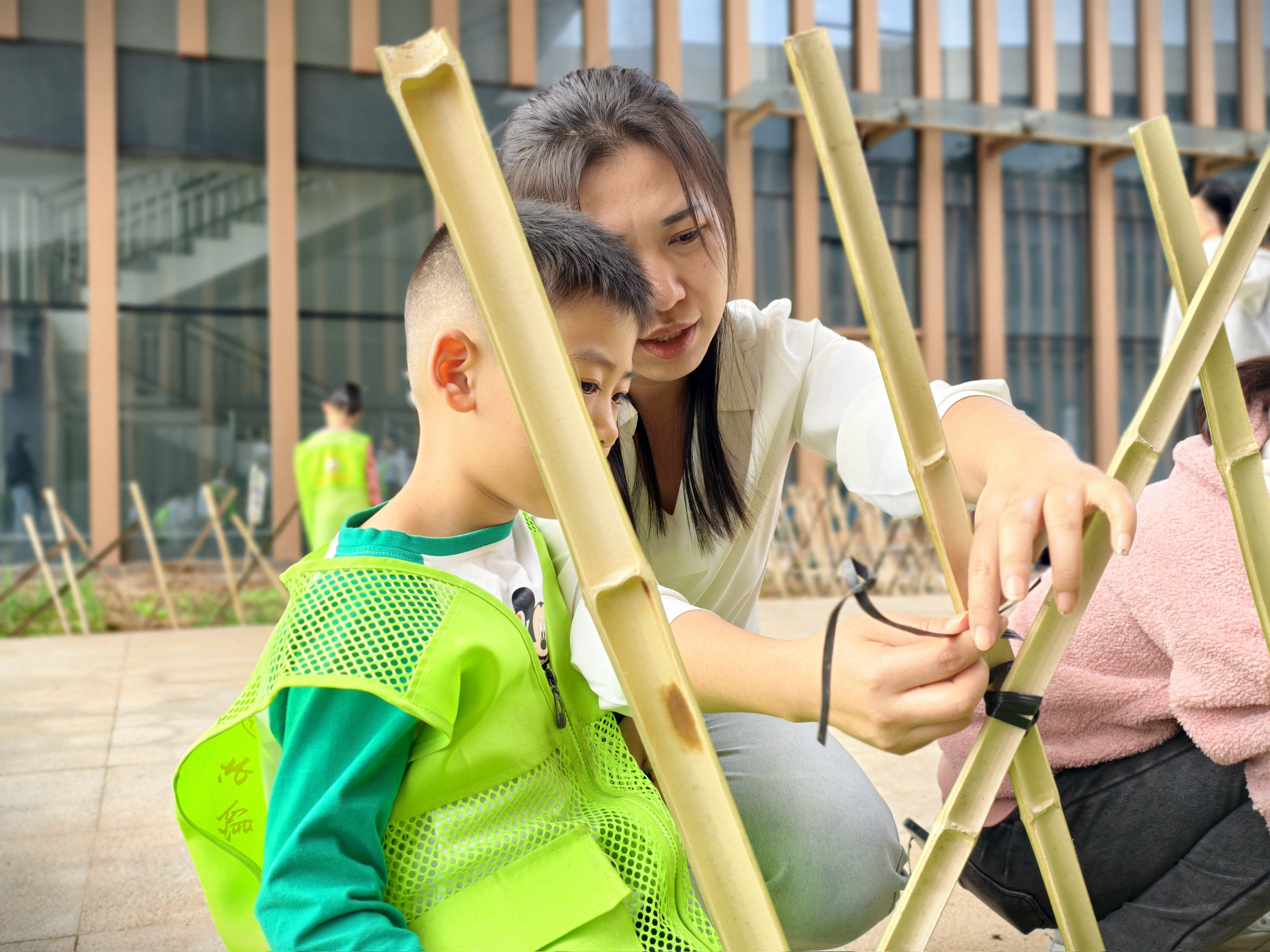 劳动实践环节是本次活动的亮点。亲子家庭携手合作,共同清理菜园中夏季和秋季作物的枯枝败叶,亲手翻松菜地;同时,活动还融入环保理念,指导大家将咖啡渣拌匀制作有机肥,通过深翻拌匀为菜地增添养分,为厚土种植做好充分准备。随后,大家有序领取当季蔬菜苗,共同完成播种、移栽与浇水等农事操作,体验从培育到呵护的农耕乐趣。亲子协作共同修护篱笆的任务进一步增强亲子默契。