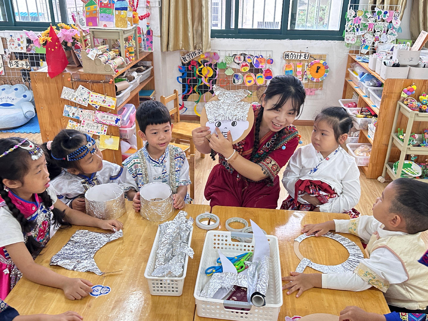环境是无声的教科书。黄金卡分园着力在园内打造民族团结示范活动区,走廊里的民族文化展板、活动区的民族乐器与手工艺品、户外的民族游戏场地,每一处都是浸润式教育的课堂,呈现出了“中华民族一家亲”的生动图景。孩子们在日常活动中,耳濡目染地感知各民族风情,在充满包容与尊重的环境中,初步建立起对多元一体中华文化的直观认知和亲近感。