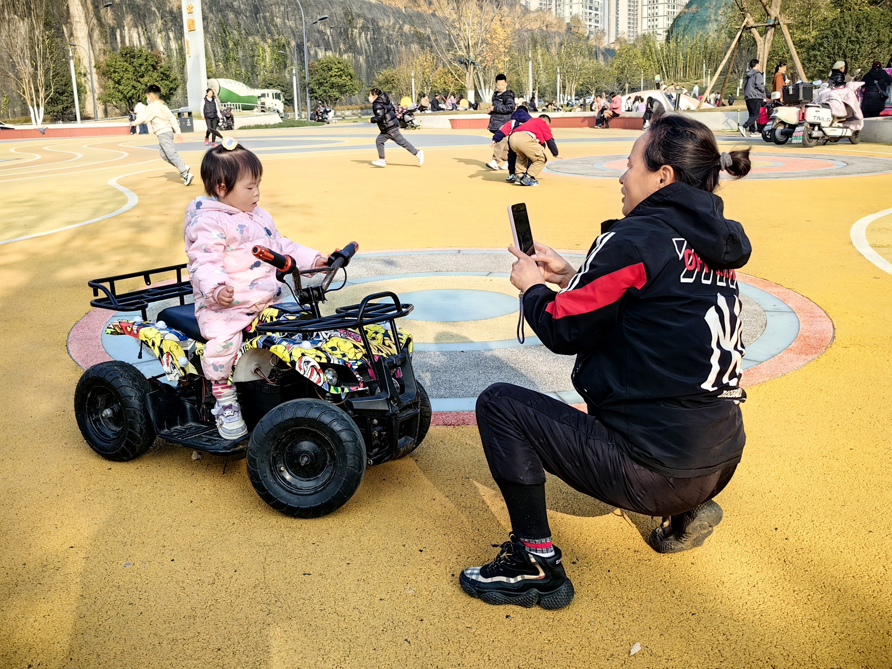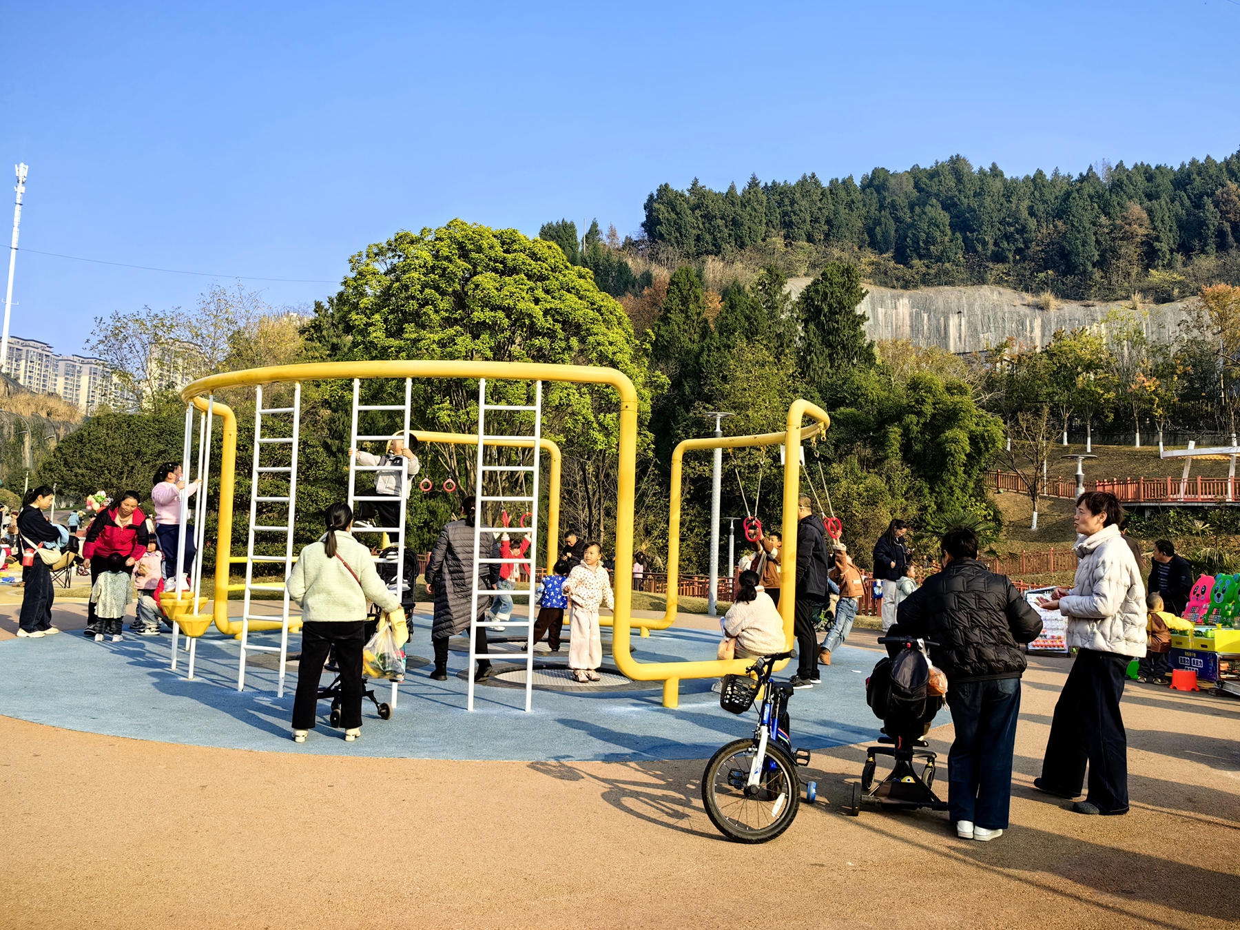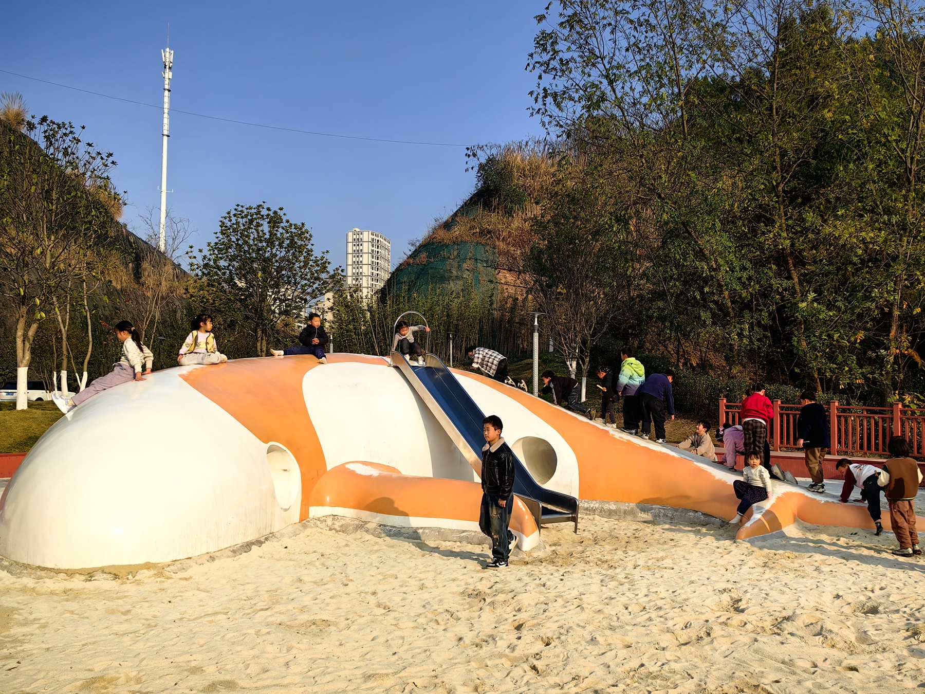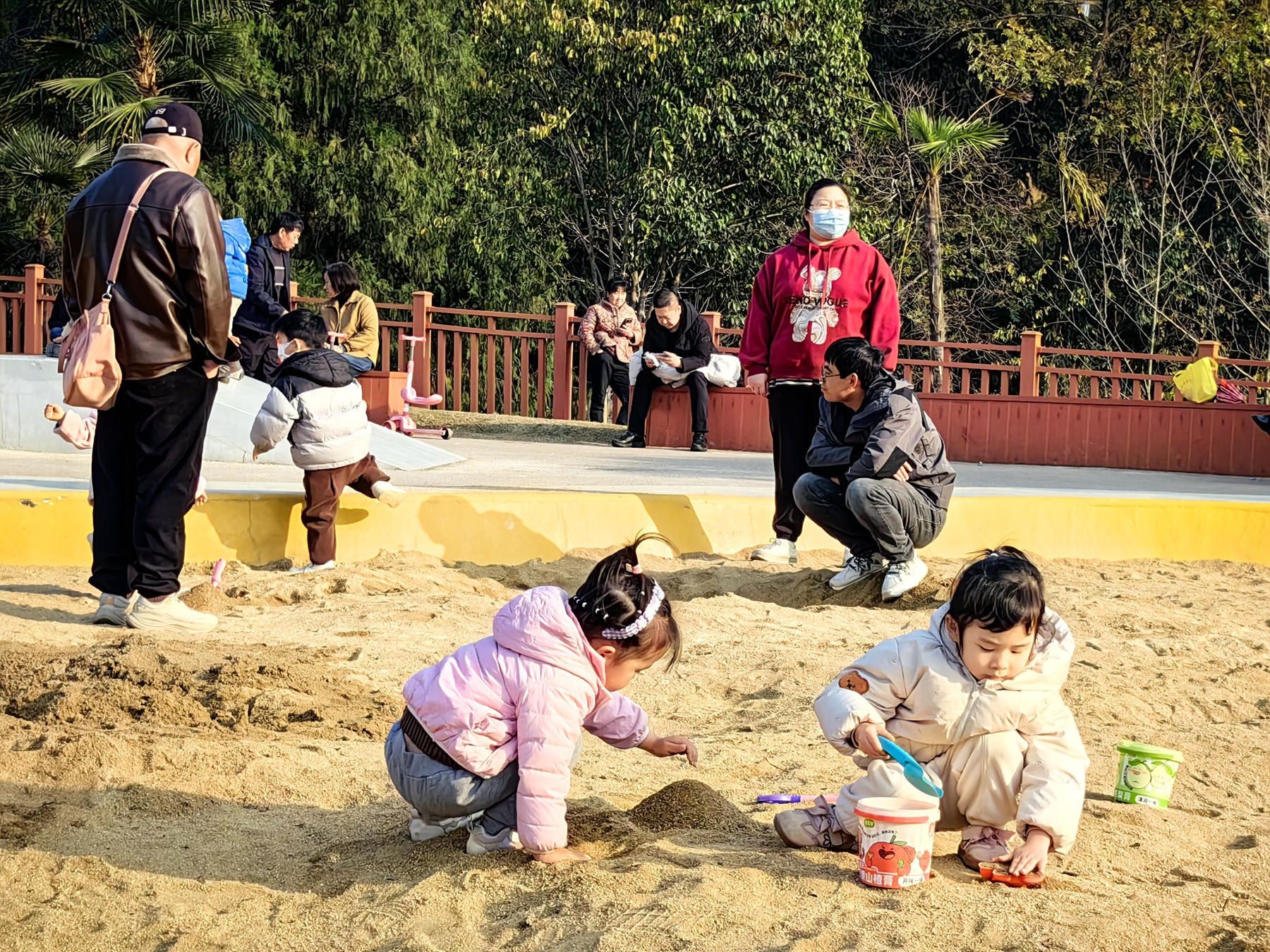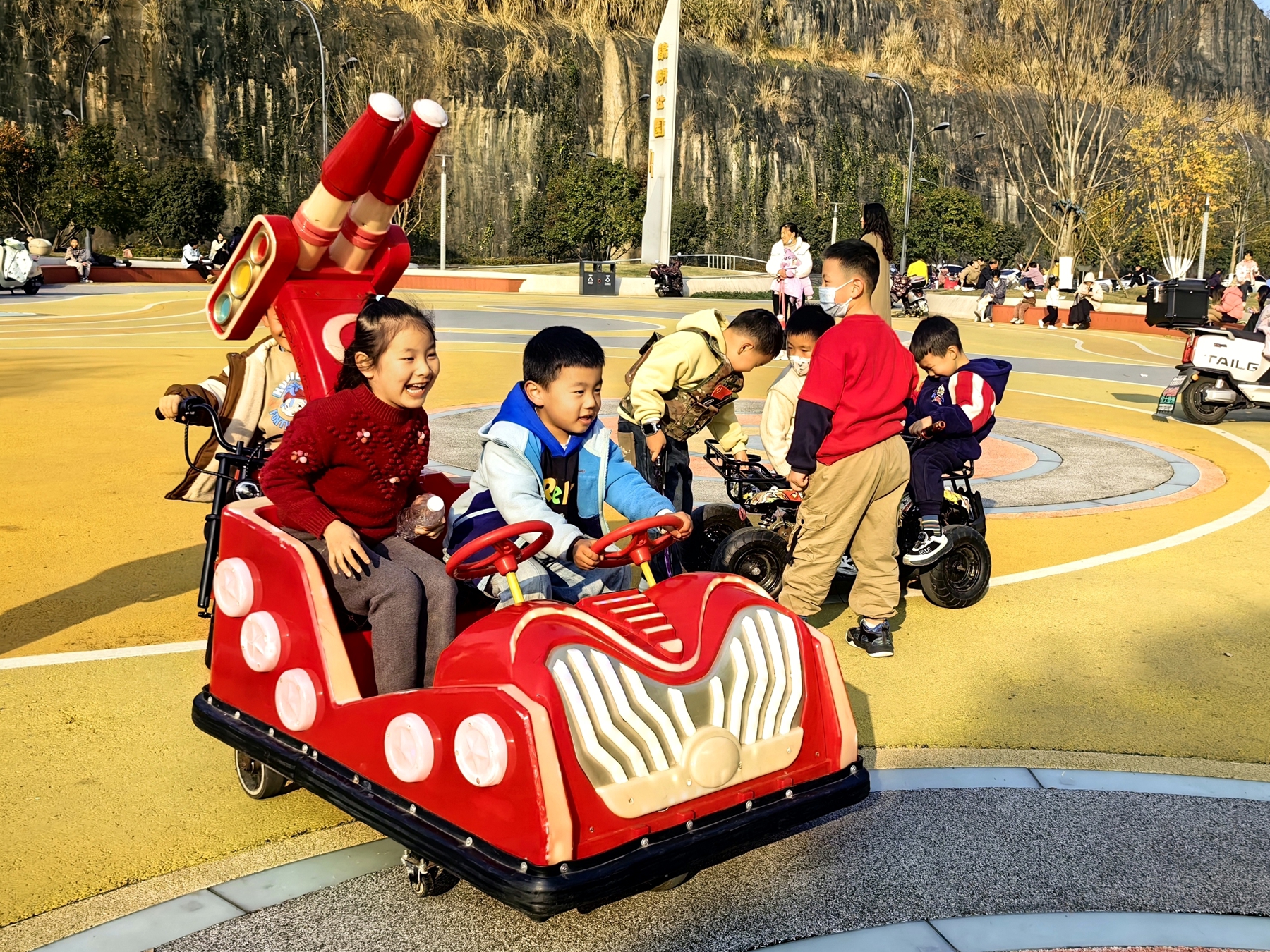 走进锦湖公园,童趣肆意绽放:孩子们或蹲在沙池里堆砌城堡,或坐进碰碰车欢快穿梭,又或是攀上鲸鱼造型的游乐设施嬉笑打闹。