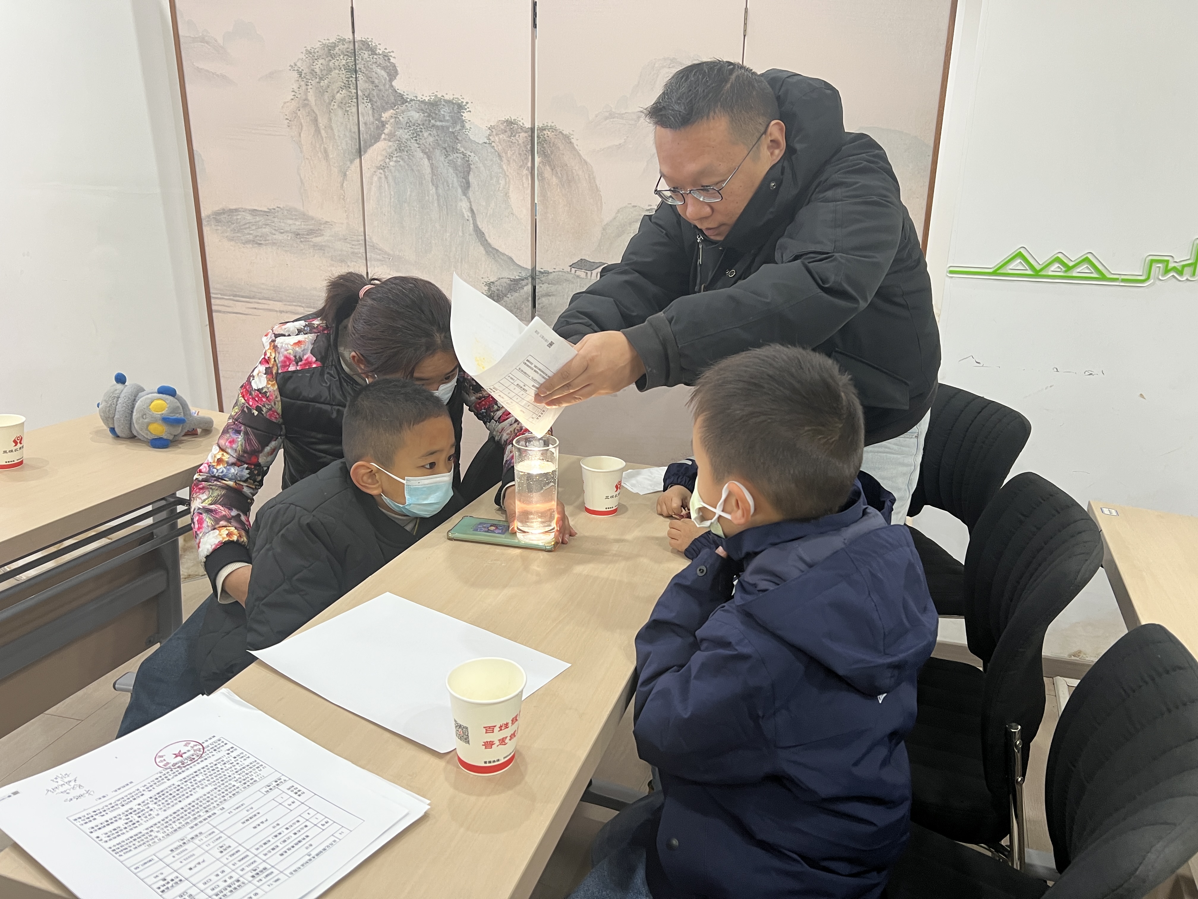 最令人期待的科学实验环节,“火山爆发”“彩虹水”“流星雨”实验依次登场。在老师的细心指导和全程监护下,孩子们分组动手操作。“先倒半杯清水,再慢慢滴入色素”“小心加入小苏打,别洒出来啦”,小小组员们分工合作,有的负责添加材料,有的专注观察变化,有的及时记录现象。当模拟火山“喷发”出红色泡沫时,孩子们惊呼着拍手叫好,不少孩子凑近观察,脸上满是兴奋与震撼;制作彩虹水时,看着不同颜色的液体分层叠加,孩子们好奇地探头张望,不停向工作人员追问“为什么颜色不会混在一起”。活动室里充满了欢声笑语与求知的提问声。