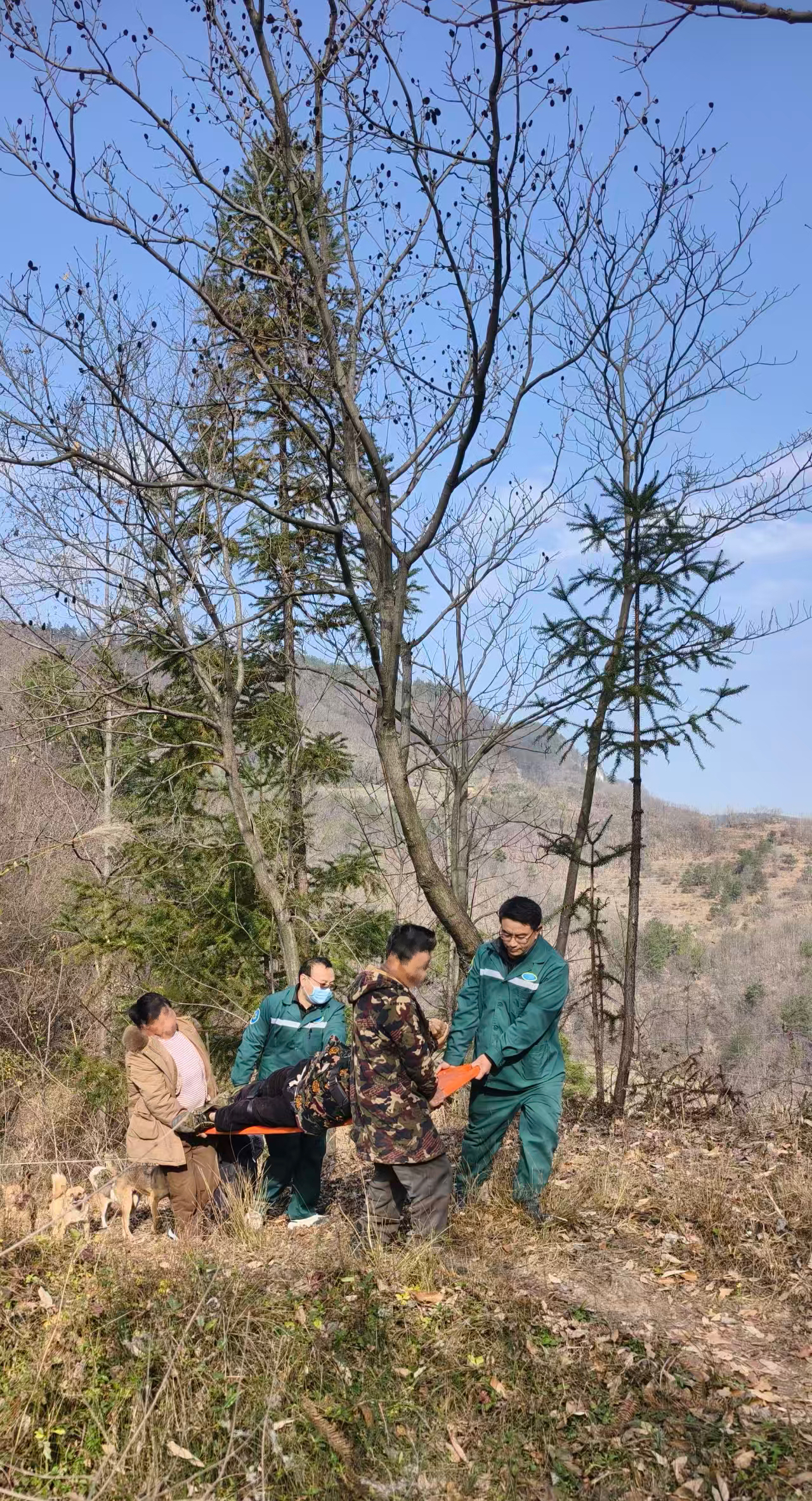 翻过两道山坡,众人找到额头渗血、腿部无法活动的老人,迅速检查伤情、清理伤口并安抚,随后即刻转运。坡陡路滑,四人抬担架步步稳挪。寒风中,绿色急救服成为山野间最暖的底色,近二十分钟才将老人安全抬至山下。