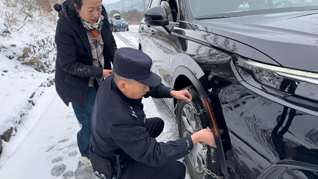 今日上午,一名游客的车辆在部分结冰路段因轮胎打滑无法前行。巡逻民警发现后,立即帮助游客安装防滑链,并指挥车辆安全驶离。临行前,民警还不忘叮嘱冰雪行车注意事项。风雪虽寒,但守护的温度不减。